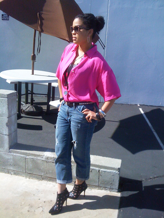 “… I absolutely love scouring thrift shops! Nowadays you have stores like Urban Outfitters mass producing vintage inspired looks, but the real treasures are hiding on racks in your local thrift shops! My fave item right now is a HOT pink silk blouse I picked up for $4.99 at my local Goodwill.”