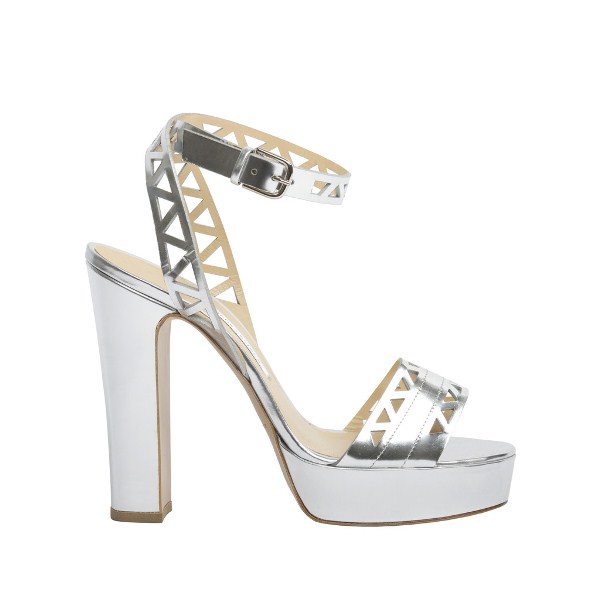 Her Pre-Fall 2015 sandals showcase geometric laser cut front straps, buckled ankle straps, and 5.1″ block heels.