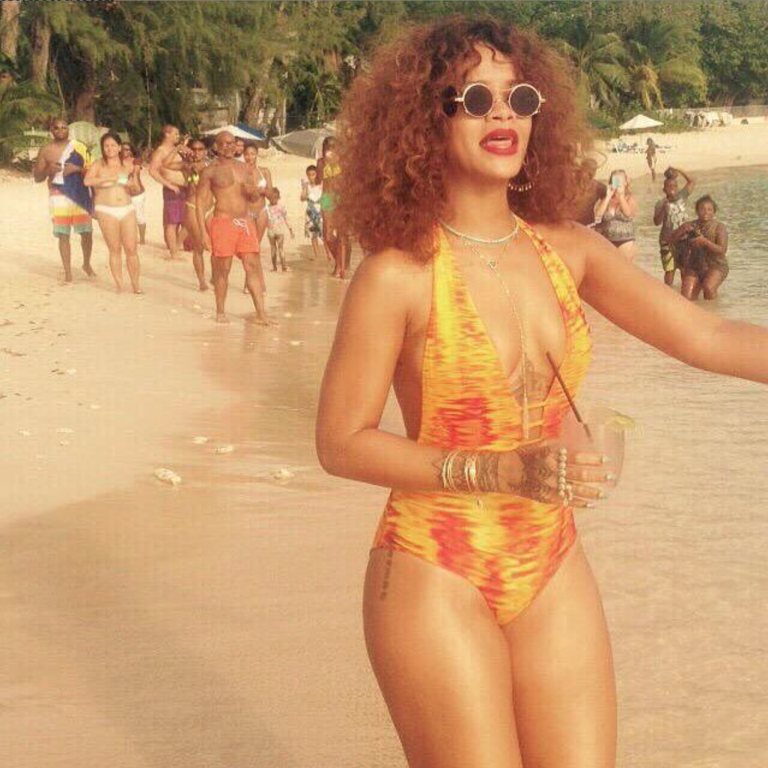 Rihanna kicked back for yet another sultry swimsuit shot in a $95 Farrah Python Printed Halter Bikini by her favorite swimwear designer, Charlie by Matthew Zink: