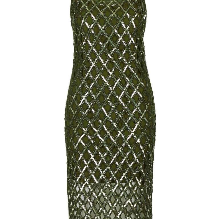 The Shine Off Sequin Dress uplifts crystal detailing at the neck, silver studs and tons of black beading.