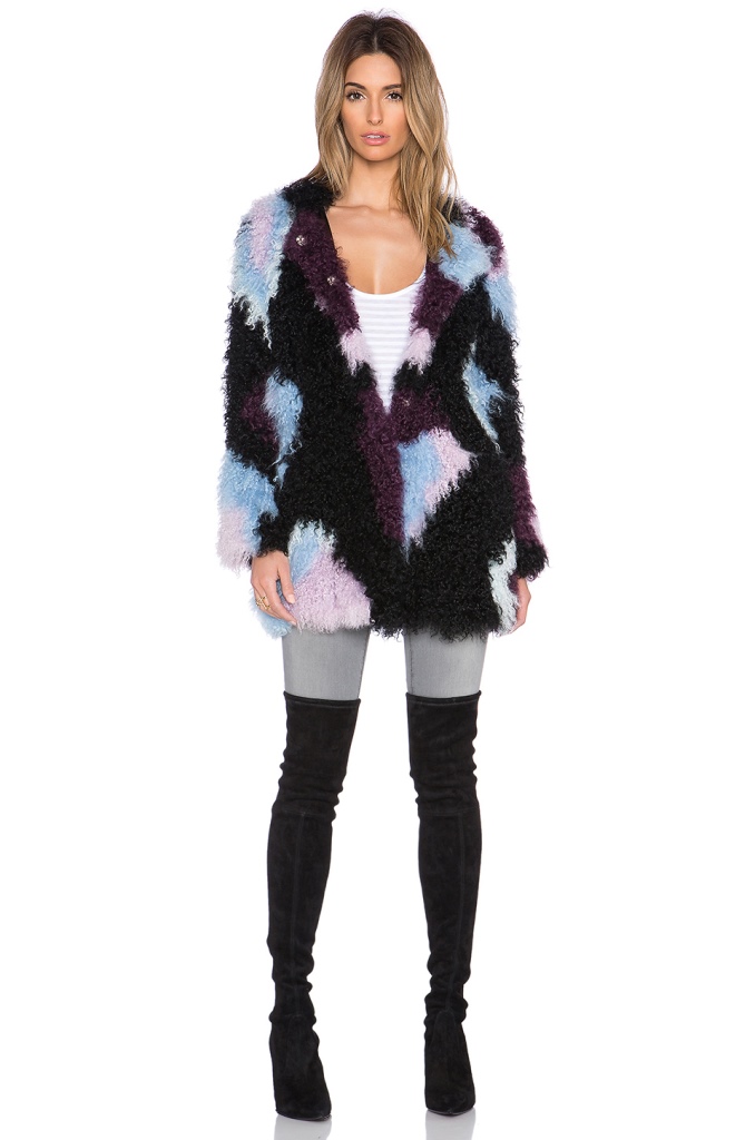 Her multicolor jacket is crafted from shaggy lamb fur.