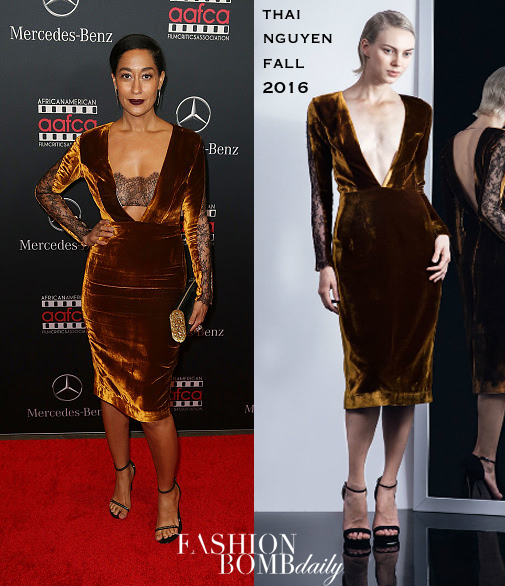 Tracee Ellis Ross never disappoints. She appeared on the Red Carpet in a Thai Nguyen Atelier dress. The sleeves throw me a little, but overall I love the dress and the color and fit on her.