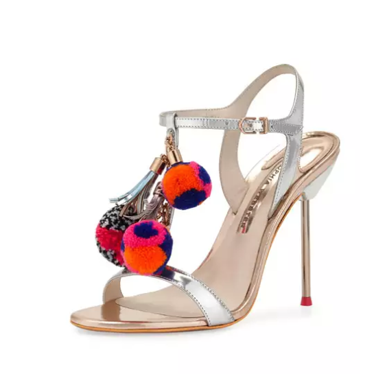 Her shoes are poppin! The 4″ suede zip cage sandals have a pom-pom charm and beaded heel.