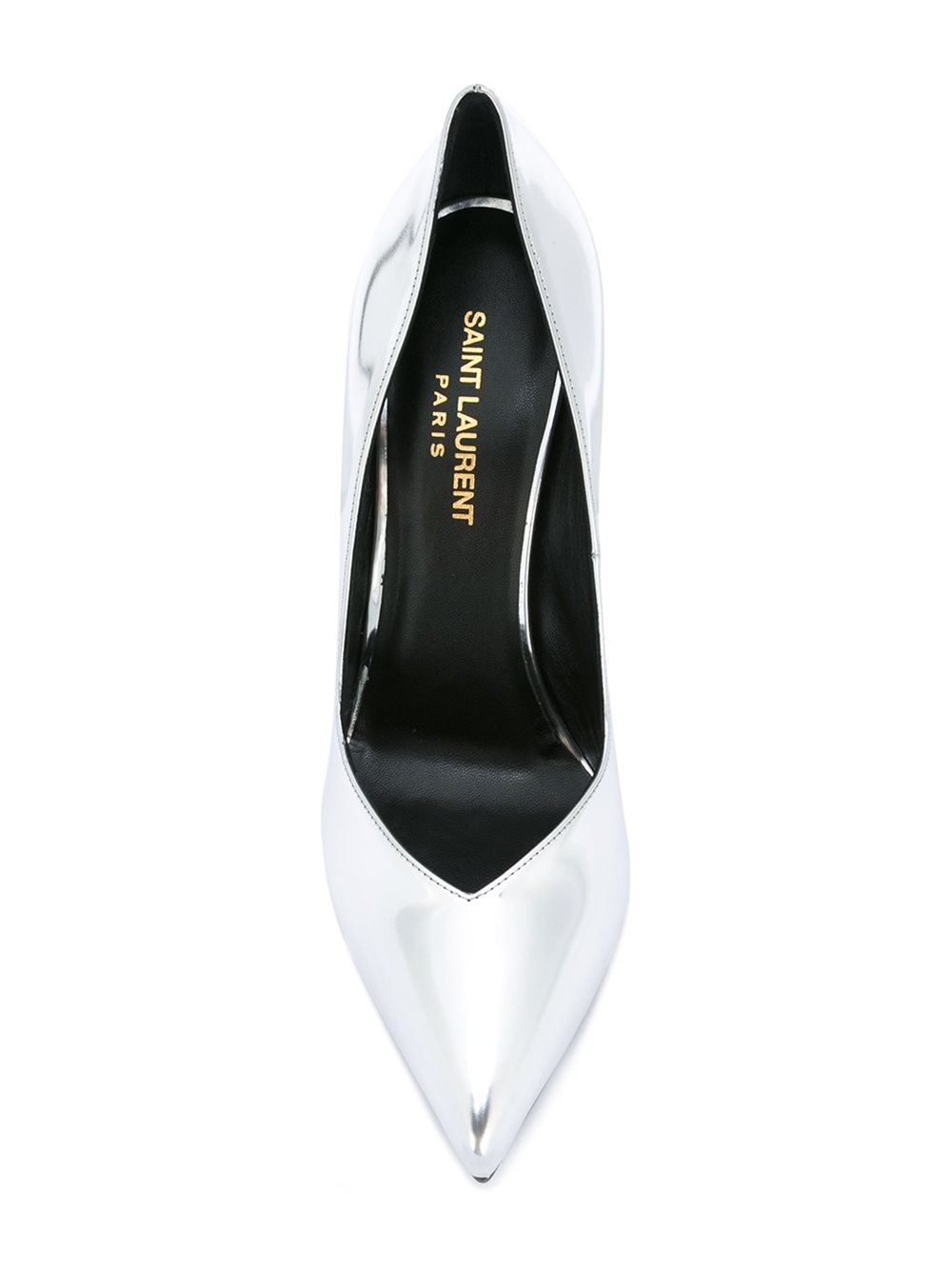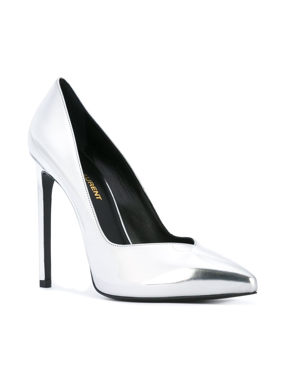 Check out these fab $695 Saint Laurent “Paris” Metallic Silver Pumps: