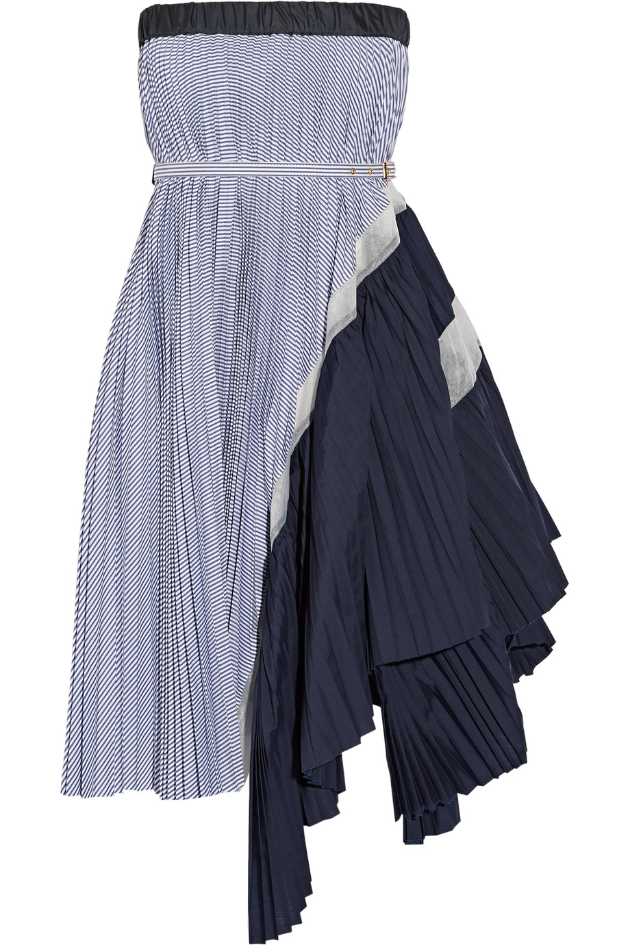Her blue and white cotton-poplin and white organza dress features a strapless silhouette, elasticated waist, asymmetric hem, detachable belt, and plisse pleat detailing.
