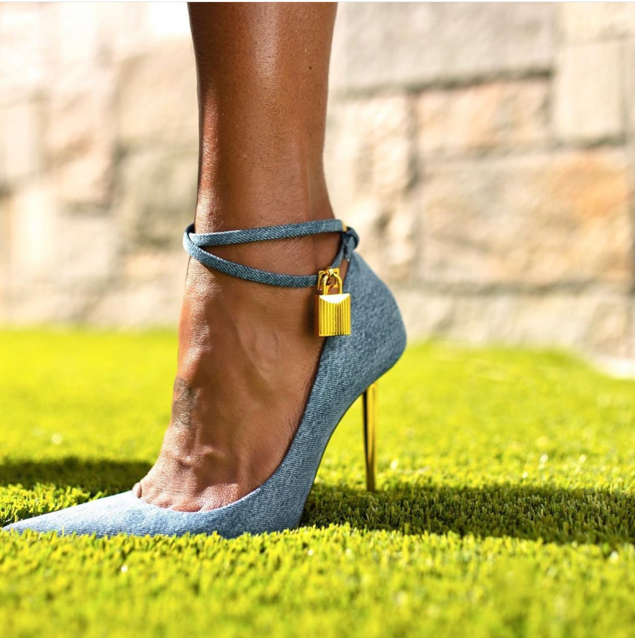 The new must have heels for Fall? Tom Ford’s classic Padlock Pumps and Sandals, cast in delectable denim.