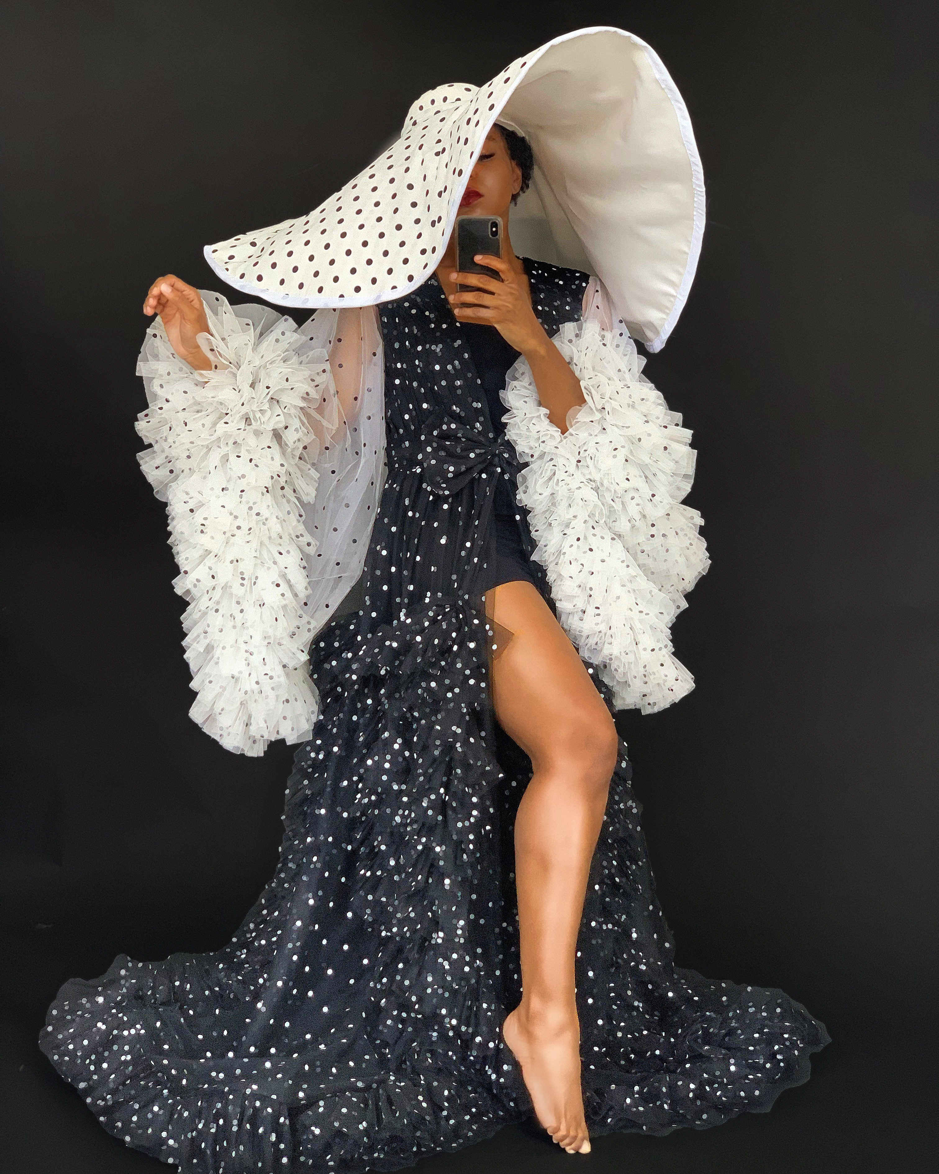Oyemwen continues to innovate with new pieces, like this polka dot sheer tulle robe, in all white/black dots and contrast prints.