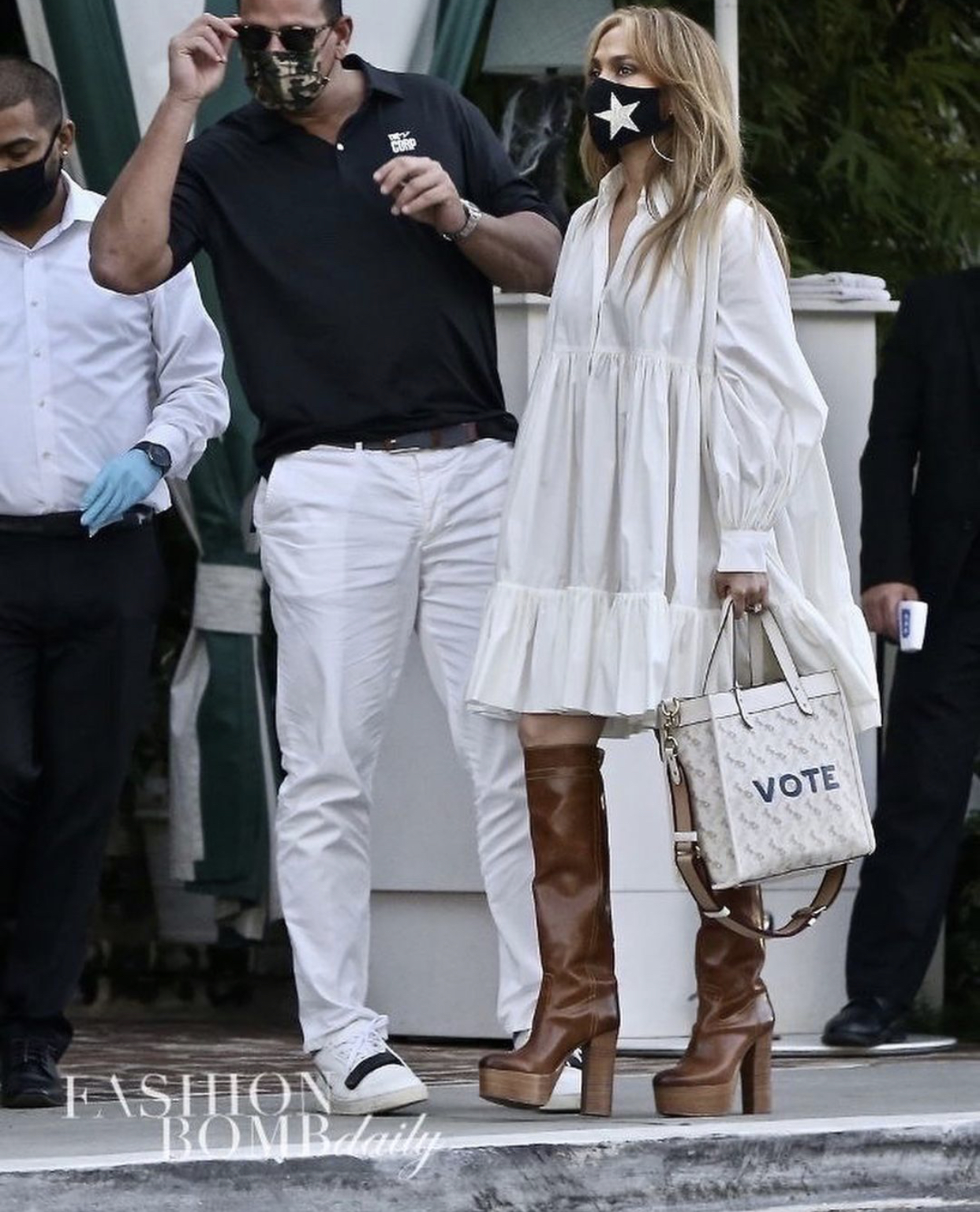 Jennifer Lopez stepped out with her fiancé A-Rod aka Alex Rodriguez for a day out in a chic look and a customized bag with the word “Vote”. Let’s get into her outfit details: