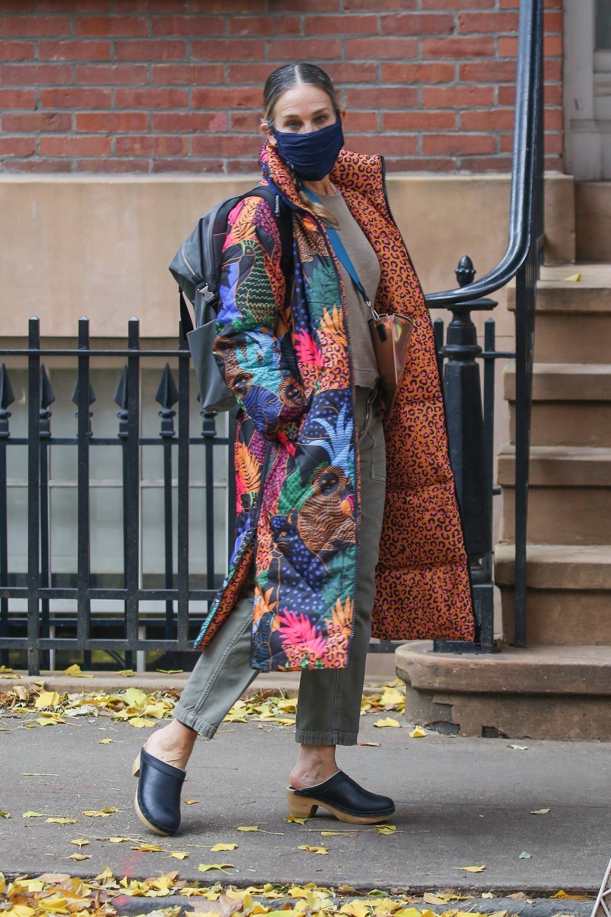 New York, NY – *EXCLUSIVE* ‘Sex and the City’ star Jessica Parker keeps warm in a stylish and colorful Farm Rio Jungle Pop Puffer coat as she steps out in the chilly Big Apple.