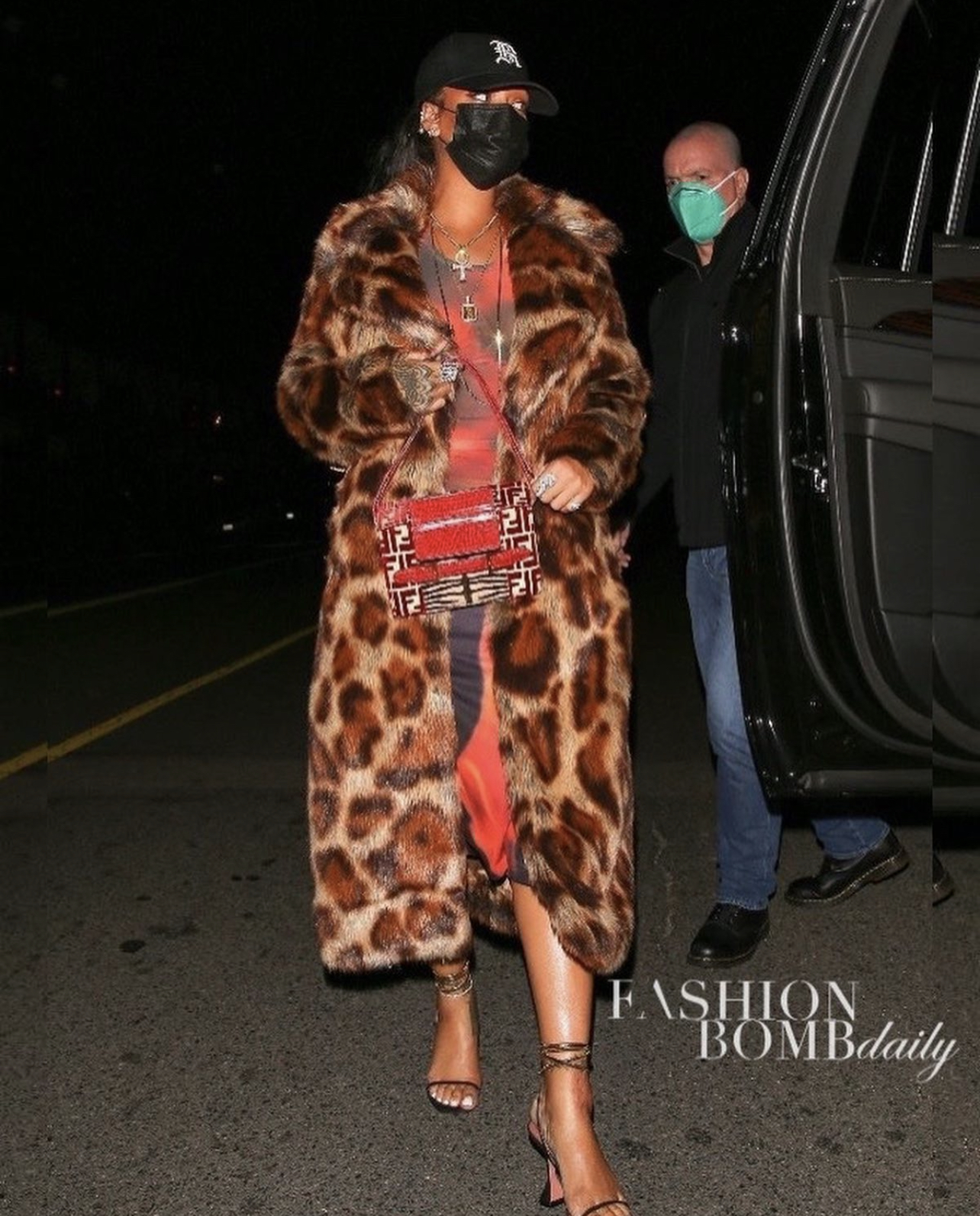 Rihanna wore a Dries Van Noten Fall 2016 faux fur leopard coat (sold out) and Mowalola Petrol Tank Top in red tartan (sold out) paired with a $1,900 vintage 1980s Fendi mixed zebra print and monogram bag (sold out), $65 R13 black logo baseball hat and $850 Amina Muaddi black “Henson” sandals (sold out). Rihanna snagged her vintage Fendi bag from Vintage by Misty luxury retail store.