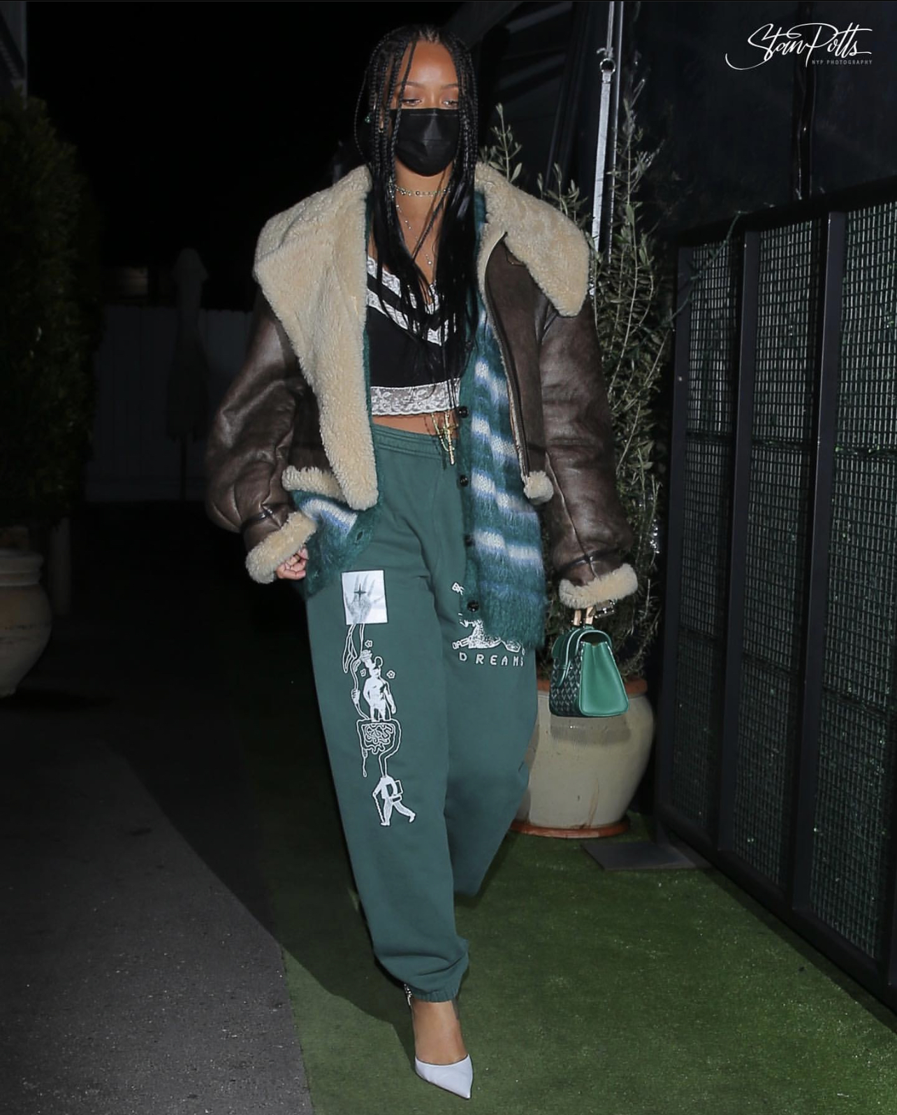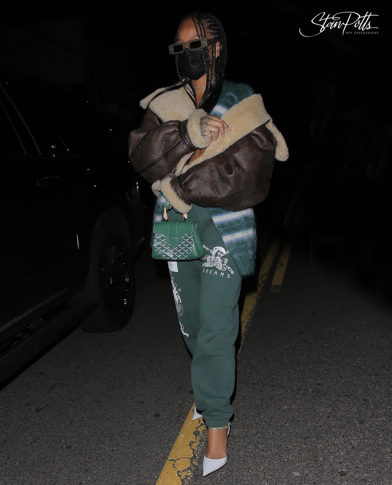 Rihanna has been out and about all week long, giving the paps and fans glimpses at the artist-entrepreneur and her notable style. She was spotted in LA yesterday evening, rocking a green ensemble which featured both high fashion and streetwear brands.