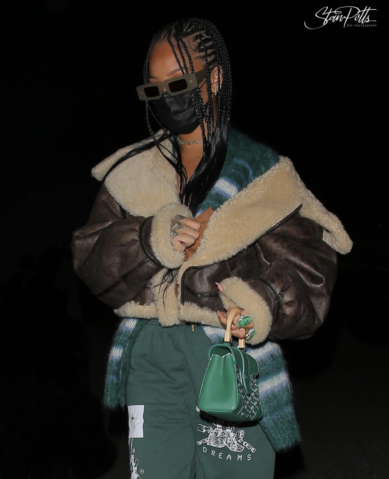 Rihanna wore a $3,395 R13 sherpa aviator jacket, $1,090 Marni Striped Brush Cardigan, $860 Miu Miu Cropped Lace Trim Cami, $140 BrainDead “Dreams” sweatpants in mallard green, $1,115 Amina Muaddi “Ursani” crystal-embellished leather pumps, and Goyard Mini Saigon Handbag (sold out). She completed the look with a face mask and olive green sunglasses.