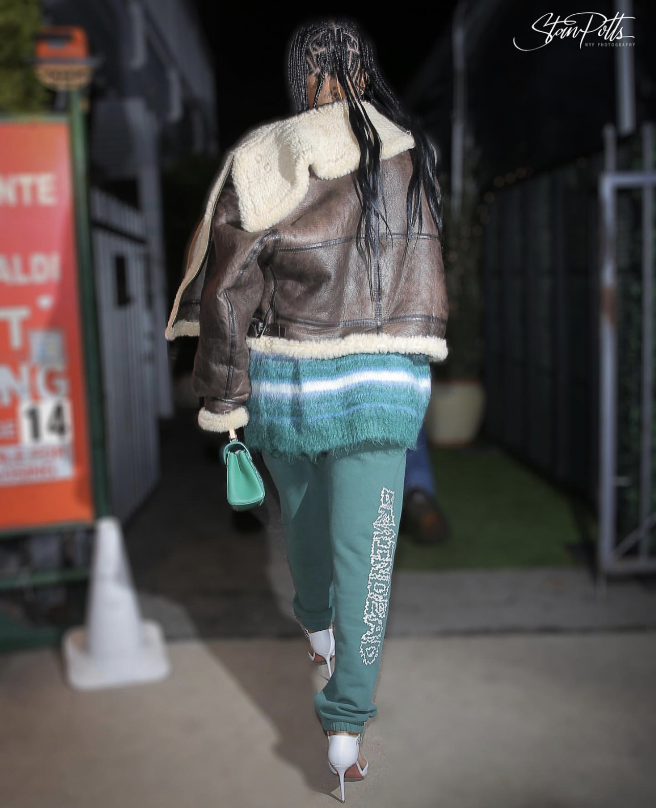 Rihanna Spotted in LA with Braids and A Look Featuring R13 Brown Sherpa Leather Aviator Jacket, Marni Green and White Fuzzy Cardigan, Miu Miu Black and White Lace Trim Top, BrainDead Green Sweatpants, Goyard Green Mini Saigon Bag and Amina Muaddi White Crystal Ankle Strap Leather Pumps