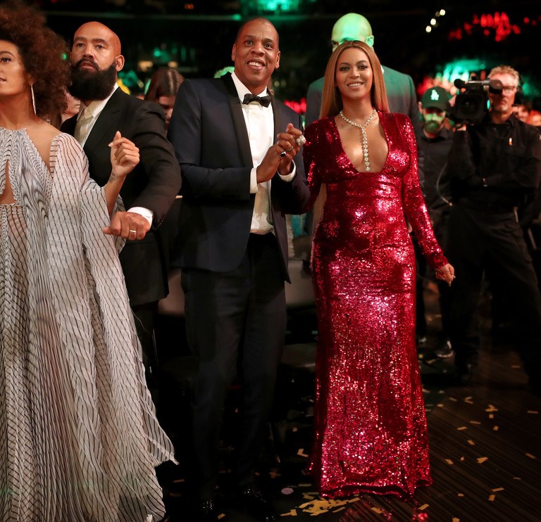 Beyonce celebrated her epic, history making Grammys win at an after party last night wearing a custom silver Burberry gown, styled by Zerina Akers .