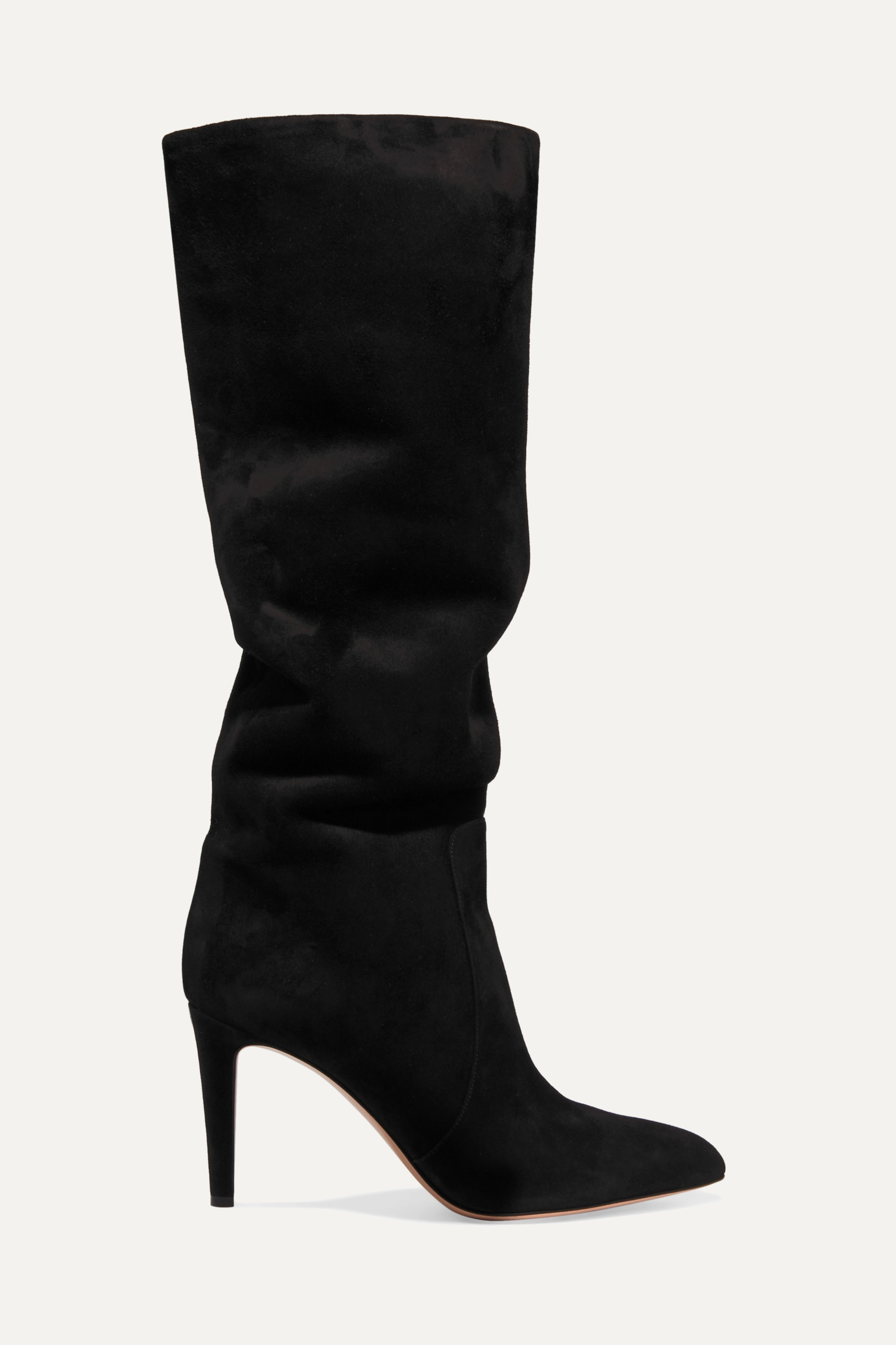 Chrissy Teigen wore $6,590 The Row “Fiera” coat, $950 The Row “Sua” cardigan (sold out), $1,625 Gianvito Rossi 85 suede knee boots, $650 Bottega Veneta double strap belt, $75 Style Guise Swarovski Crystal Mask.