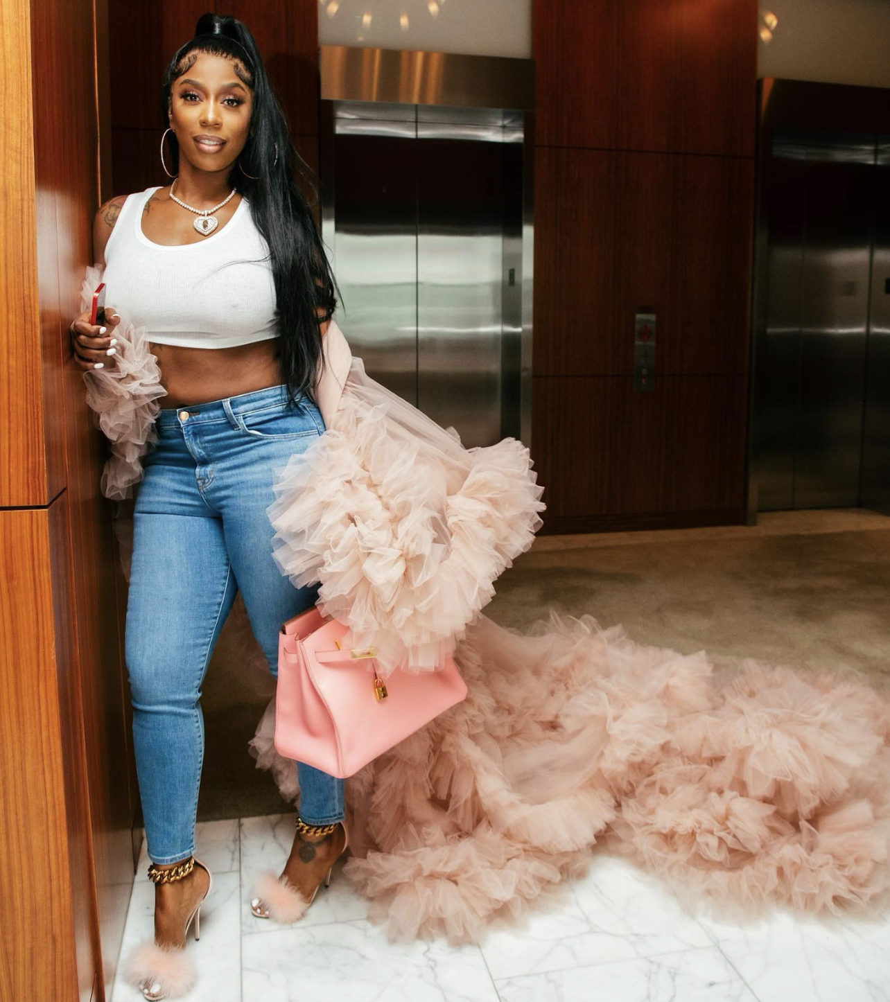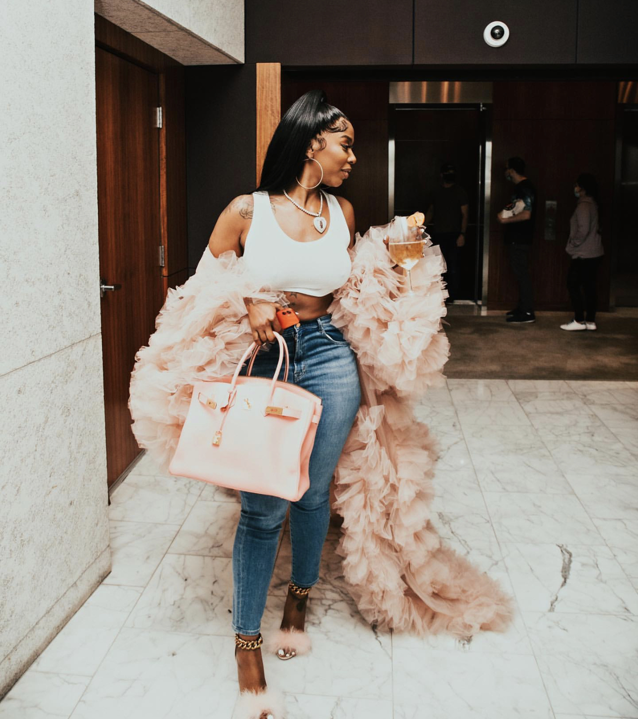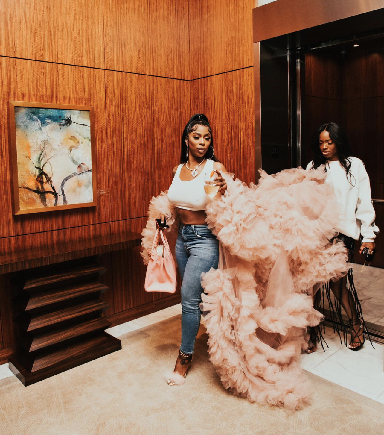 Kash Doll wore Oyemwen’s Blush Pink Tulle Robe with Train which is available at the Fashion Bomb Daily Shop! She rocked the robe effortlessly with a white tank crop top and jeans paired with a pink Hermès Birkin bag and pink feather trimmed heels which featured a gold chain detailing on the ankle. Her look was styled by Sankara Xasha Turé.
