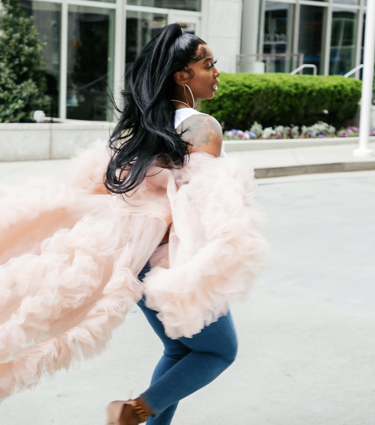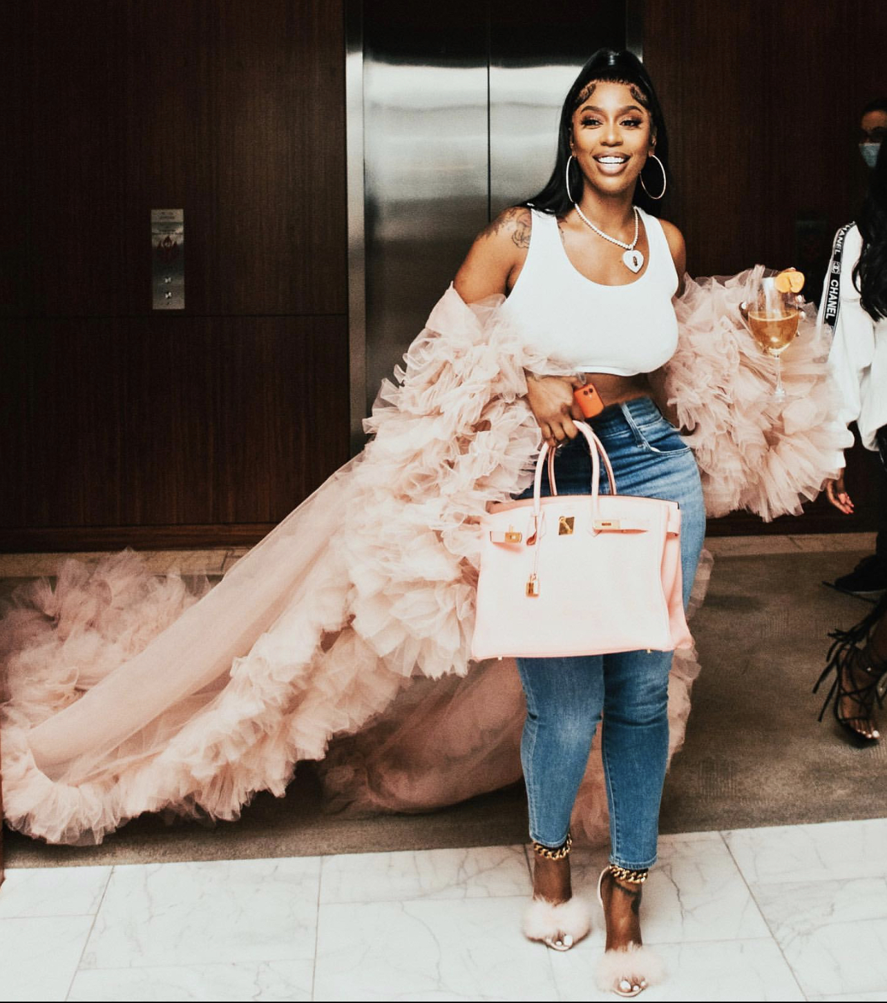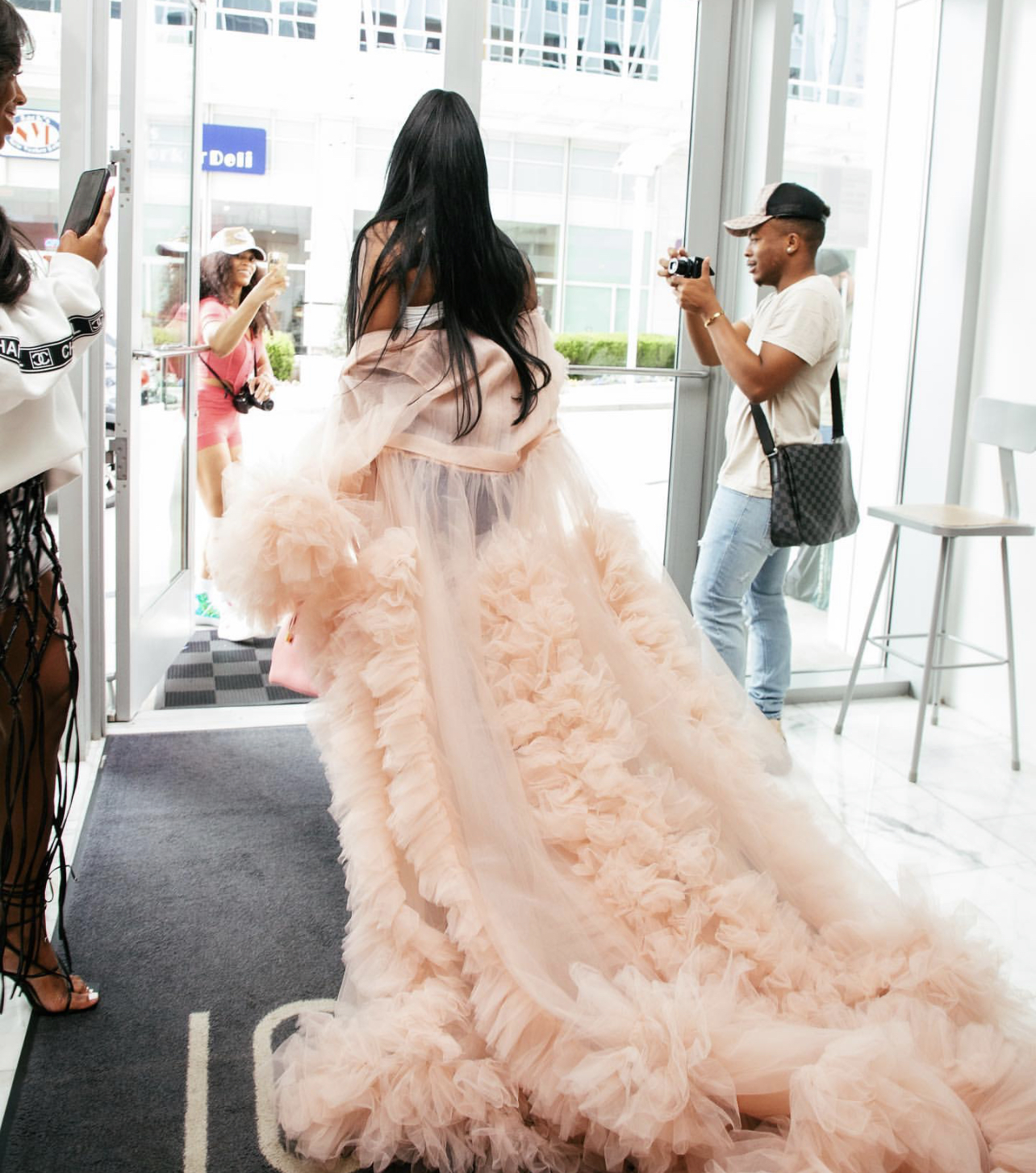 Kash Doll wore Oyemwen’s Blush Pink Tulle Robe with Train which is available at the Fashion Bomb Daily Shop! She rocked the robe effortlessly with a white tank crop top and jeans paired with a pink Hermès Birkin bag and pink feather trimmed heels which featured a gold chain detailing on the ankle. Her look was styled by Sankara Xasha Turé.