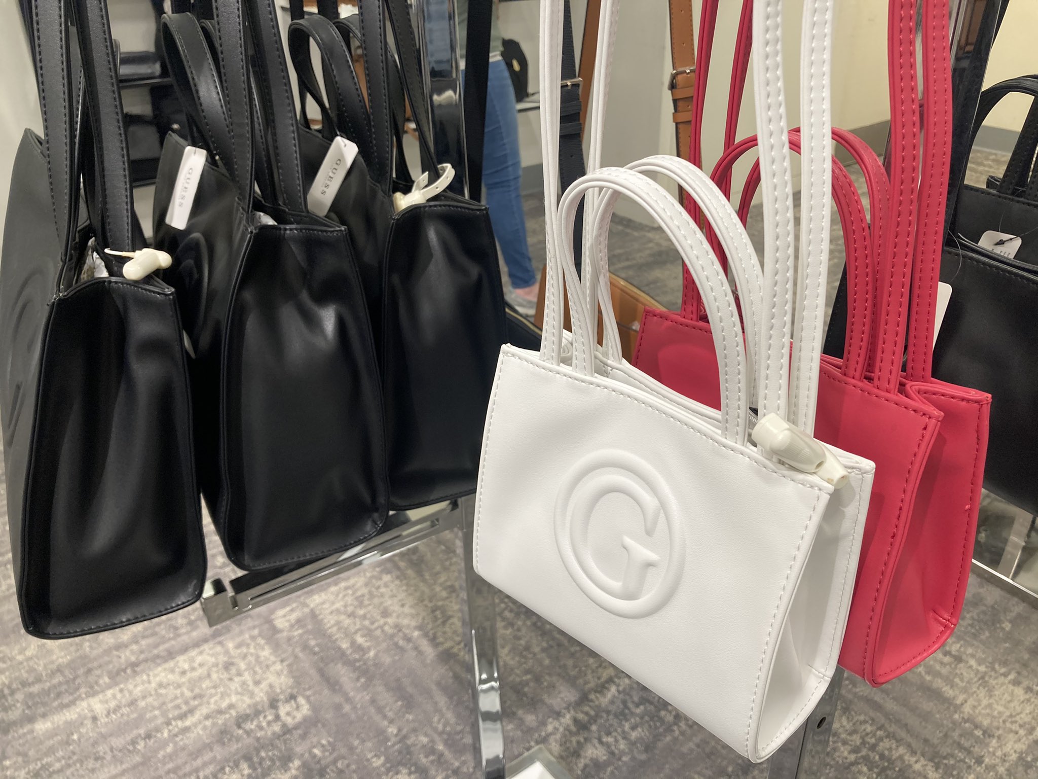 Just like Telfar’s medium white shopping bag, the Guess Embossed Logo G-Tote features the Guess “G” logo in the middle of the bag complete with two varying length handles in a medium-size rectangular silhouette. Guess also offers the bag in different sizes and colors.