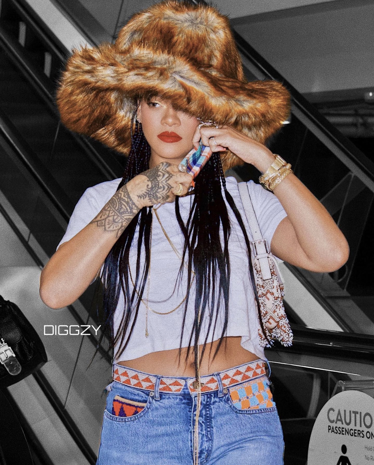 Rihanna was spotted out in LA with her best friend Melissa Forde wearing a fuzzy-chic look. Her look included a custom faux fur hat by Benny Andallo, a white cropped t-shirt, Gucci by Tom Ford Spring/Summer 1999 jeans (available for $15,534.66 in a US size 6 on 1st Dibs), a $6,500 Fendi FF Beaded Baguette Bag (sold out), and $1,390 Tom Ford Snake Print Padlock Naked Sandals (sold out).
