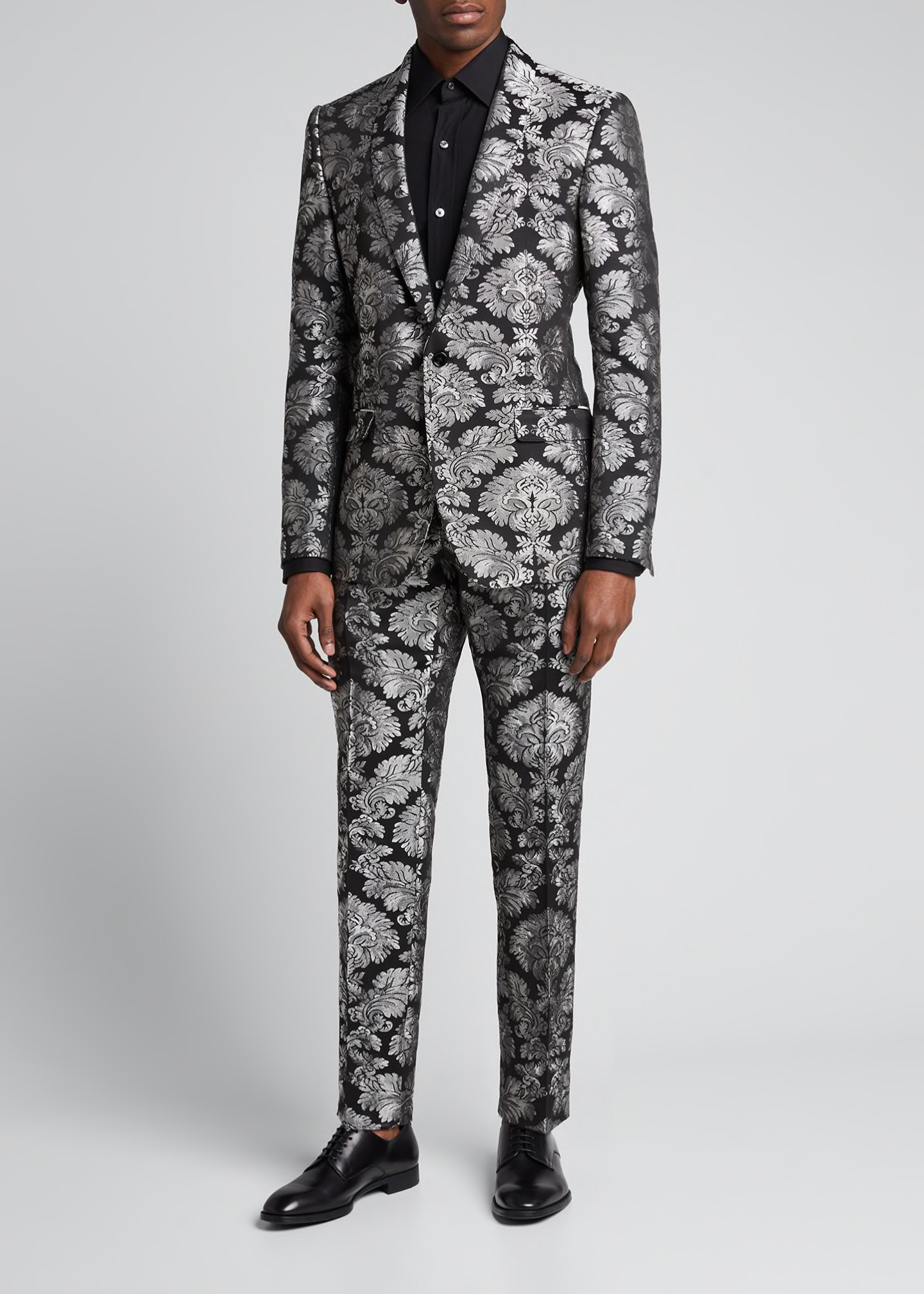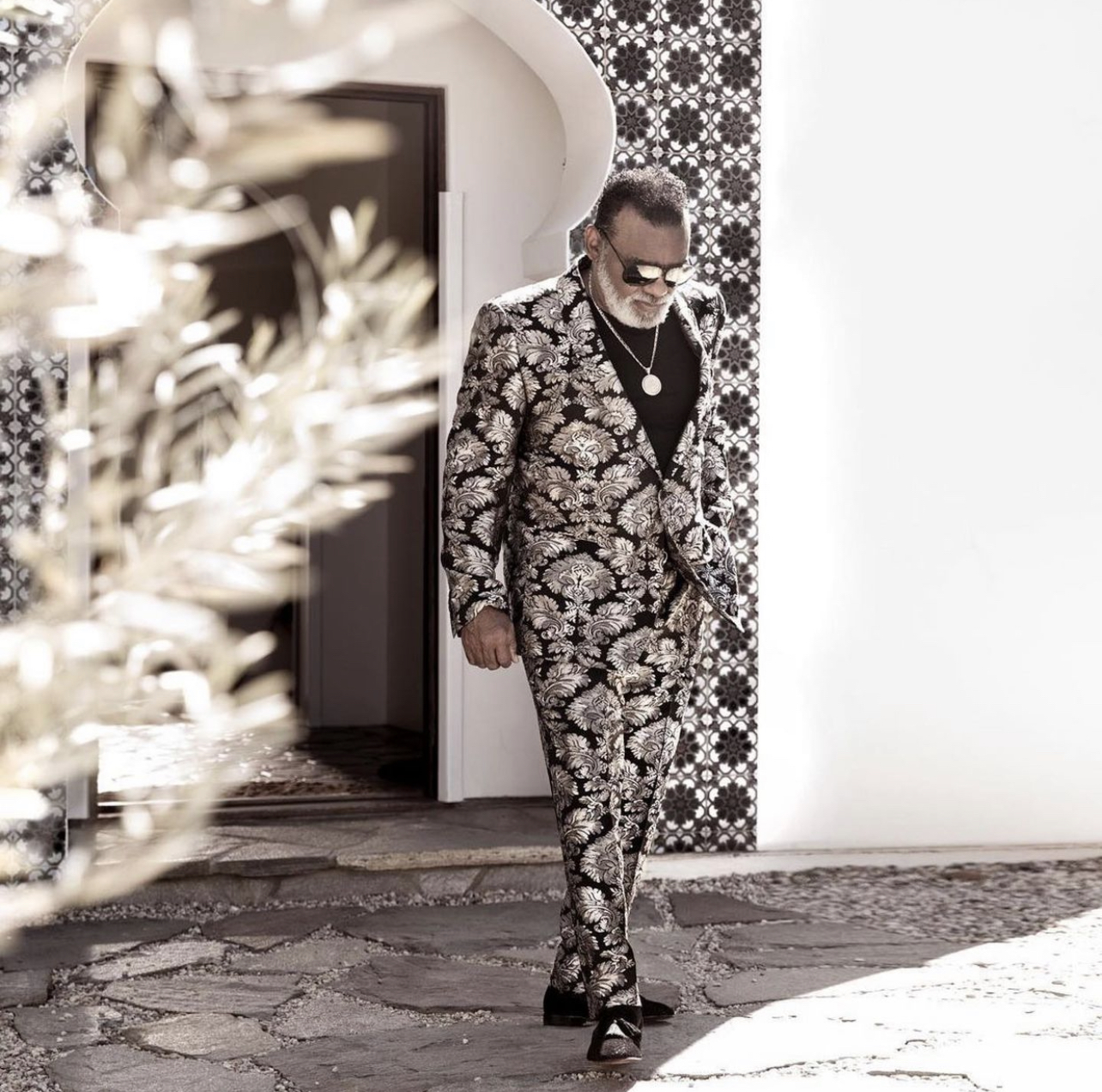 Ron Isley wore a $3,345 Dolce and Gabbana Baroque Jacquard Tuxedo Suit accessorized with Porsche sunglasses and Louboutin shoes. In another photo, he wore this suit look with a fur coat by Edwards-Lowell.