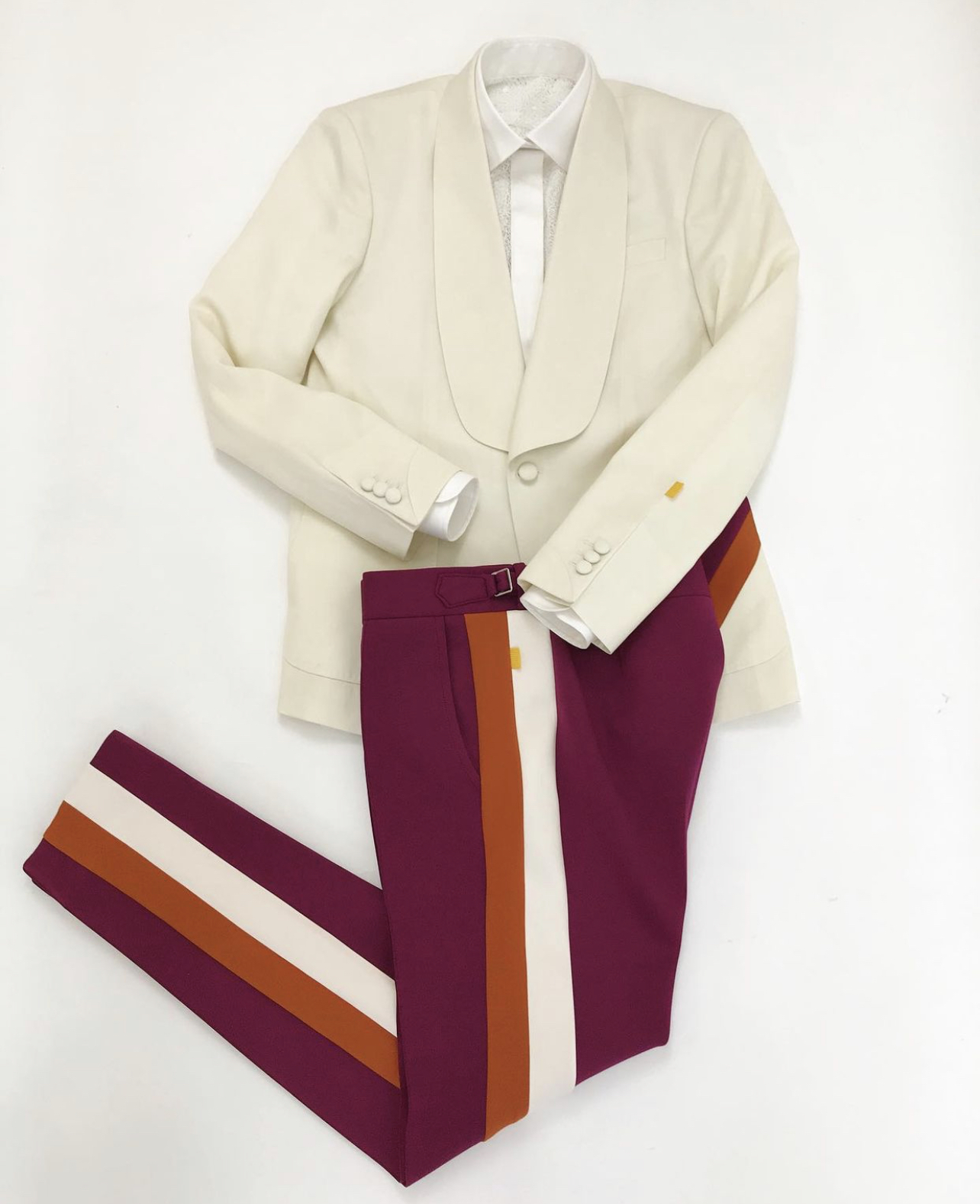 Verdine White of Earth, Wind and Fire wore a custom suit by Richfresh. The look included a cream suit jacket, white button top and berry red pants with rust and cream side stripes.