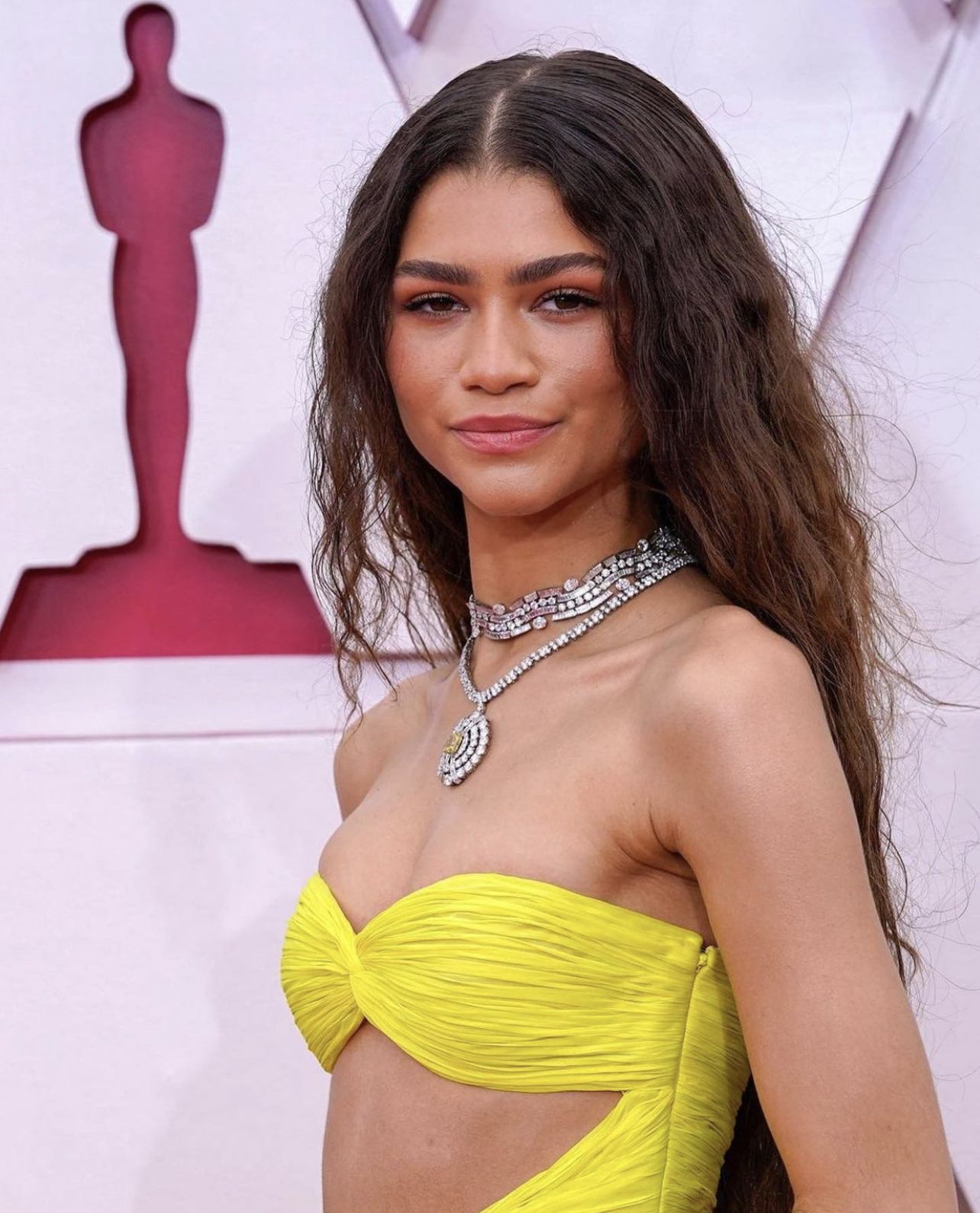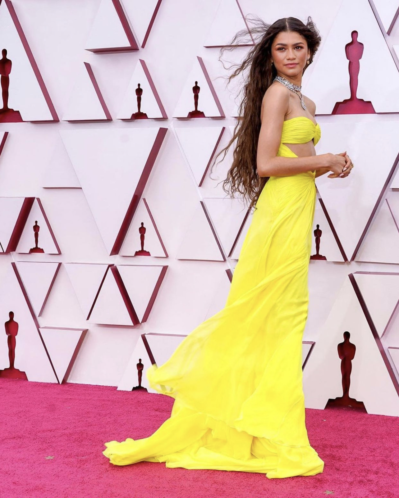 Zendaya ultimately became a show-stopper on the red carpet. The young actress appeared in a Valentino gown, styled by Law Roach. Inspired by one of Cher’s unforgettable opening looks from the The Cher Show designed by Bob Mackie, her dress was custom made and features a chiffon fabric in a bright Spring yellow hue. It was complete with a sleeveless design and cutout detailing coming just below the bandeau-style top. Valentino named it “Force de beauté” which means “force of beauty” in French. The dress took a total of 300 hours to design and construct which they saw as necessary and worthwhile when it came to Zendaya.