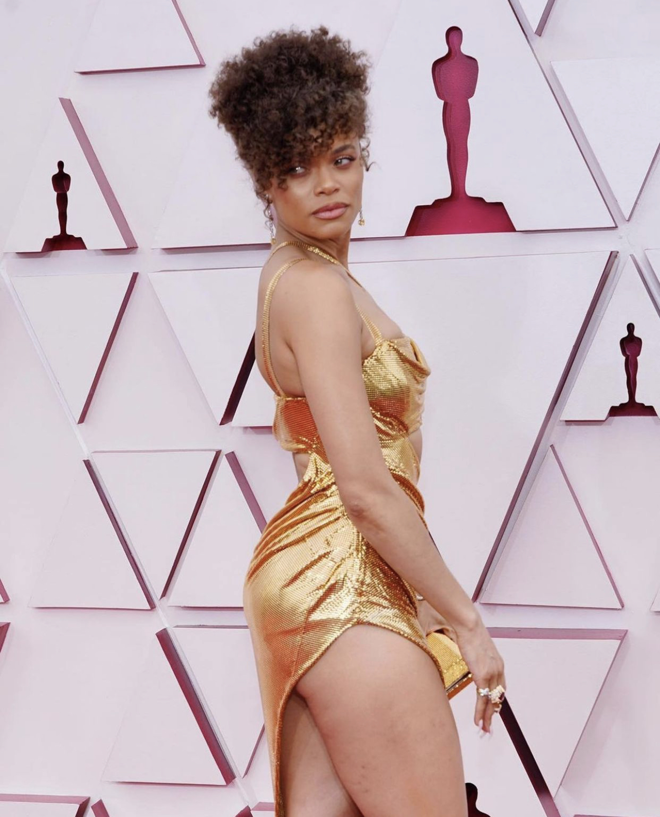 Andra Day gave us a moment of 70s sexy-glam on the 2021 Oscars red carpet. Day wore custom Vera Wang, styled by Wouri Vice and inspired by Cher’s rainbow-colored ensemble from her appearance on The Cher Show in 1975. Her gown oozed of 1970s glam with its revealing cutout details, exposed thigh slit, and overall liquid gold color. Custom made by Vera Wang, the dress also comes with a mesh fabric and the brand’s noteworthy drape detailing which all leads to the goddess-like train for the win.