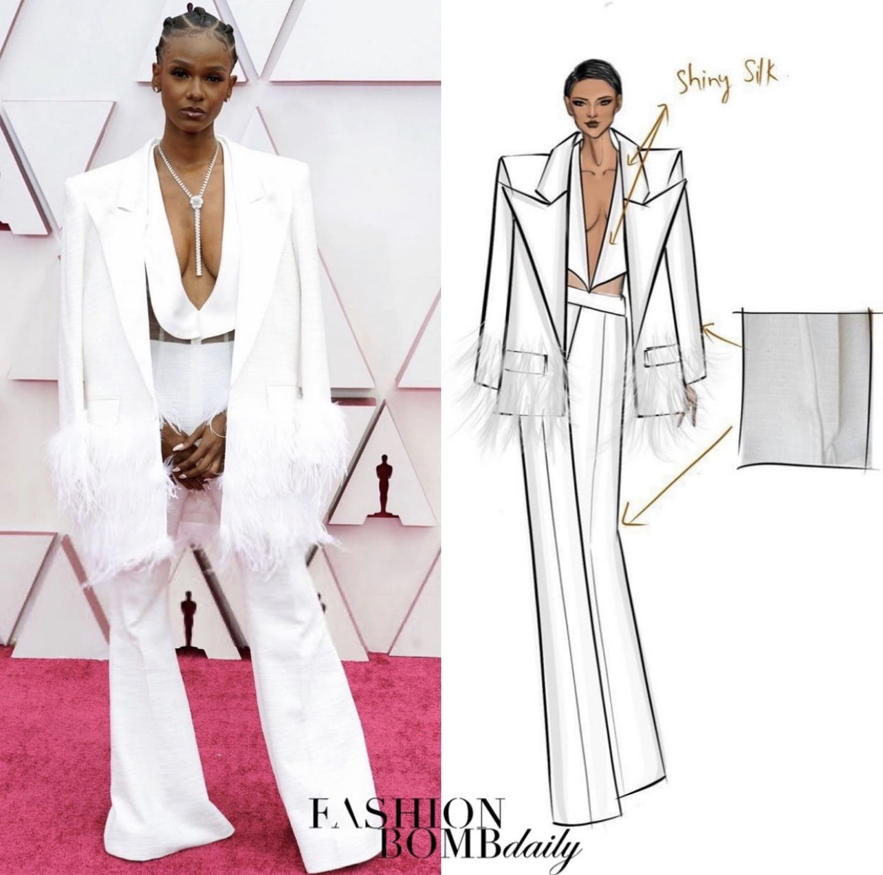 Tiara Thomas now has an Oscar to keep her Grammy company as she won Best Original Song for writing “Fight For You” with H.E.R. for Judas and the Black Messiah. She attended the Oscars wearing Jovana Louis by Jovana Benoit. Her bespoke look feature a plunging v-nck jumpsuit and structured blazer both showered in white and feather trims. Designer Jovana Benoit describes the feather choice as a “visual representation of her soul to the world”.