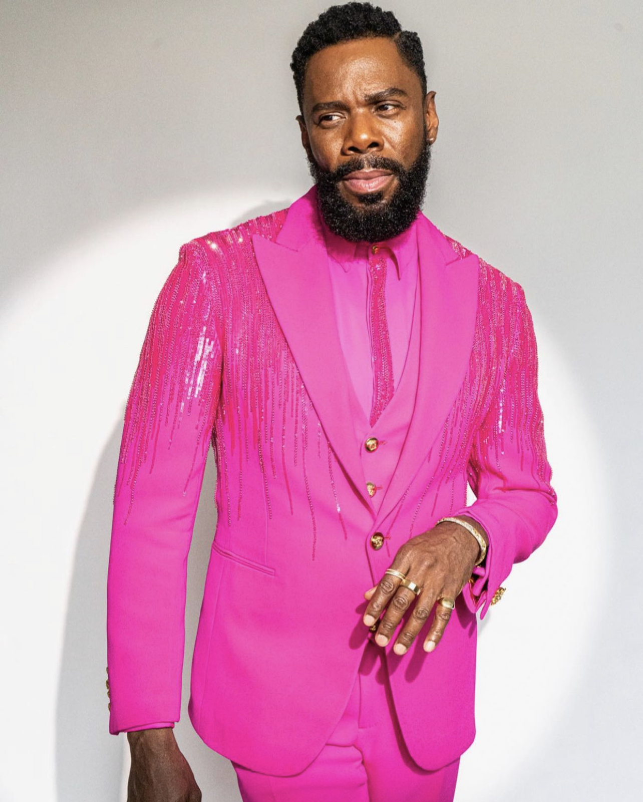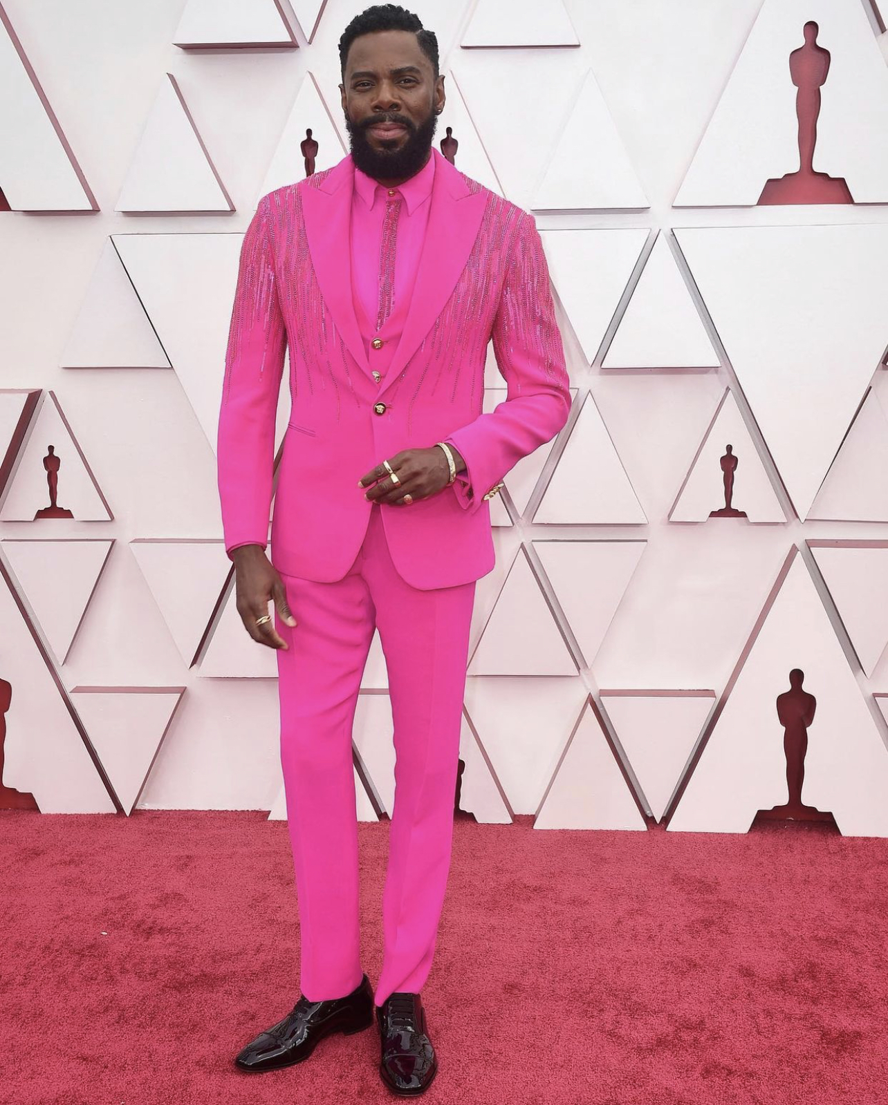 Last but certainly not least, Colman Domingo came to show us that the traditional black and white tux is a thing of the past. Domingo appeared on the red carpet in a popping pink suit from Versace, styled by Wayman and Micah. The three-piece suit is from the brand’s Fall/Winter 2020 Couture collection complete with striking details such as its fuchsia color and luxe crystal-drip pattern on the shoulders. To finish the look, he went with Christian Louboutin and David Yurman for his shoes and jewelry, respectively.