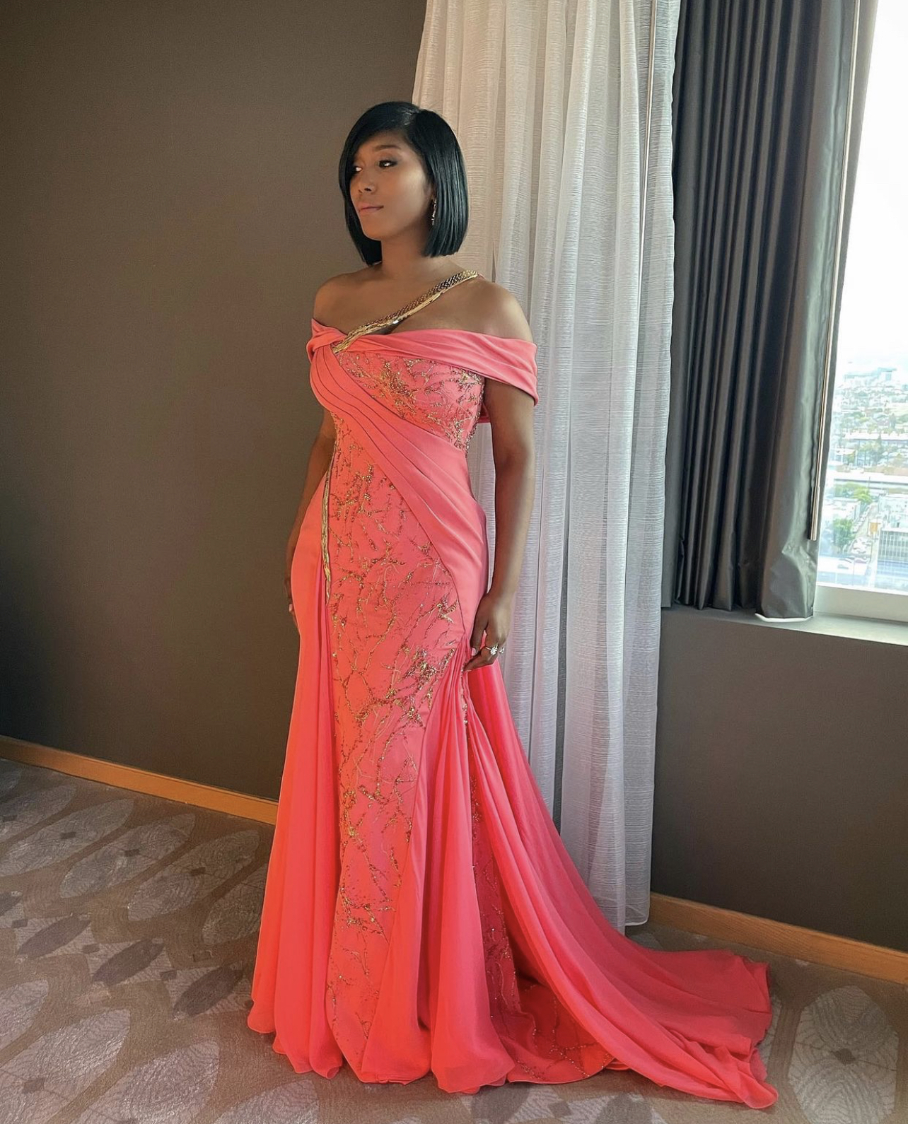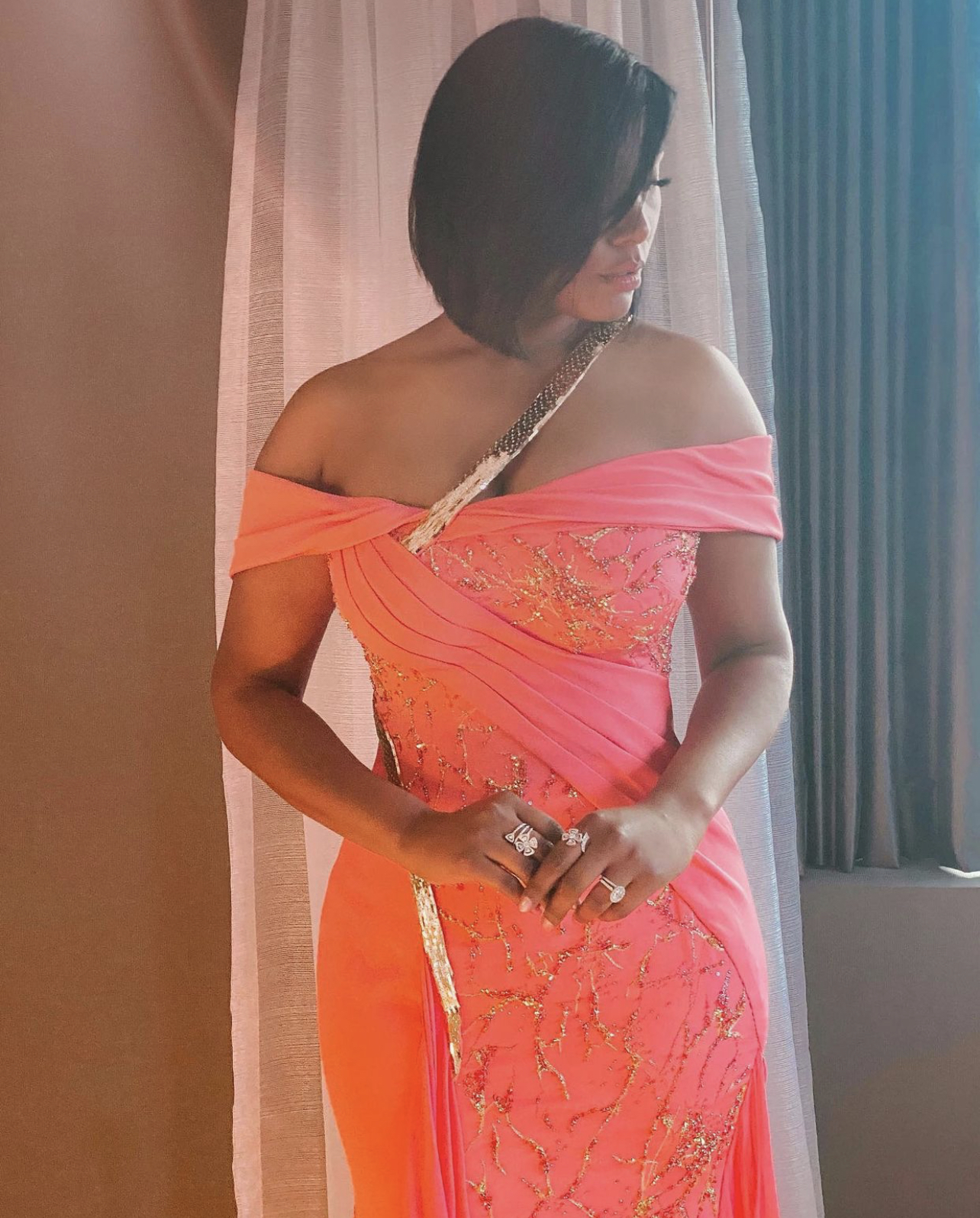 Her Versace gown was custom made and required 260 hours to create plus 300 hours to embroider, totaling 560 hours of work in all. It appears in a Summer-ready coral color with an off-the-shoulder detail and elegant drapery. It is also accented with gold embellishments including the marble effect and the single gold strap along the shoulder. The look also features Louboutin heels and Bulgari jewelry for the finish.