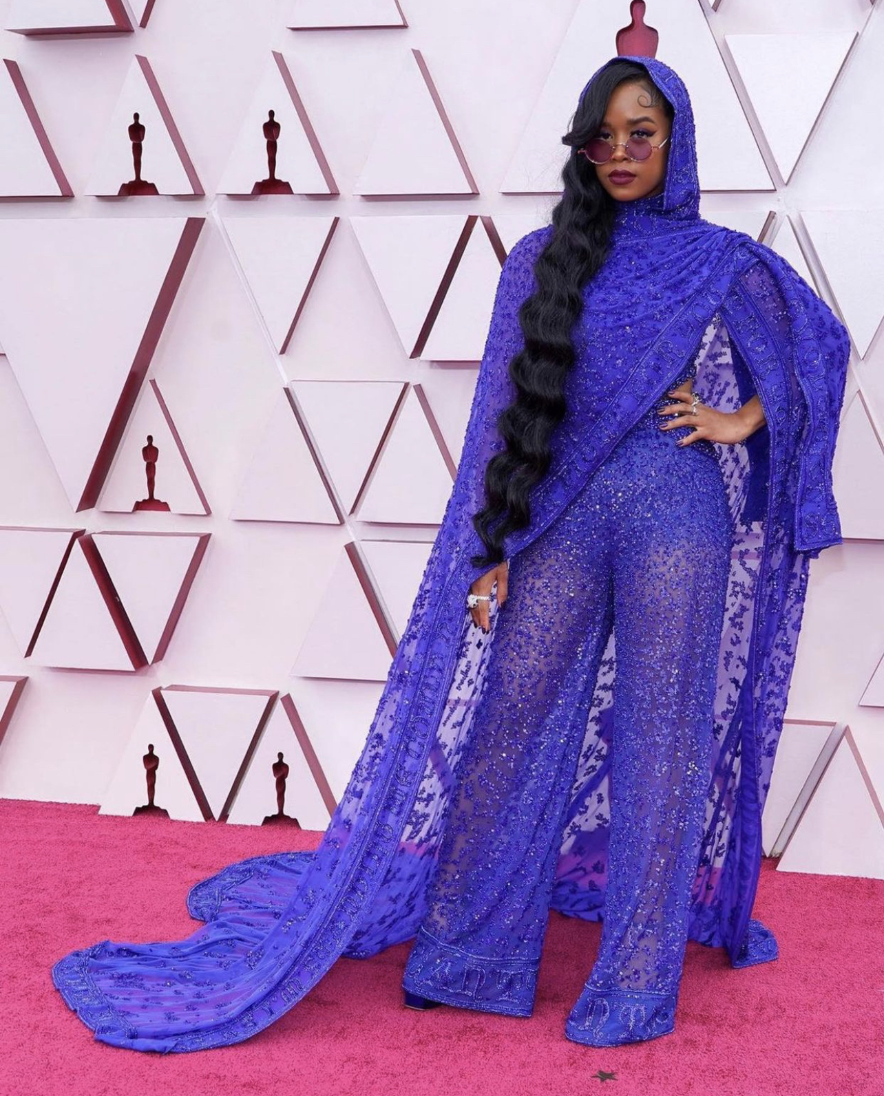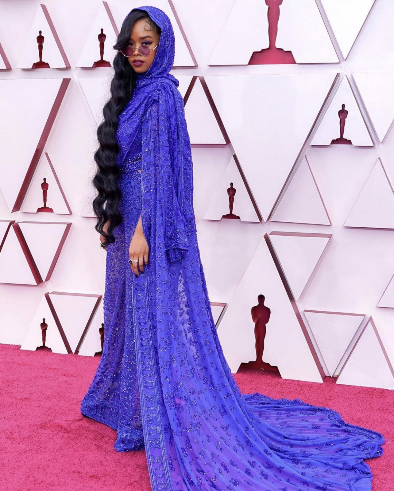 Singer H.E.R won an Oscar for Best Original Song wearing a Dundas by Peter Dundas look, styled by Wouri Vice. For her look, H.E.R channelled her inner Prince Rogers Nelson, paying homage to the late icon by recreating his look from his appearance at the 1985 Oscars. During that moment, Prince also won an Oscar for his song “Purple Rain”. So, I guess you could say the look manifested a win for the singer in a way.