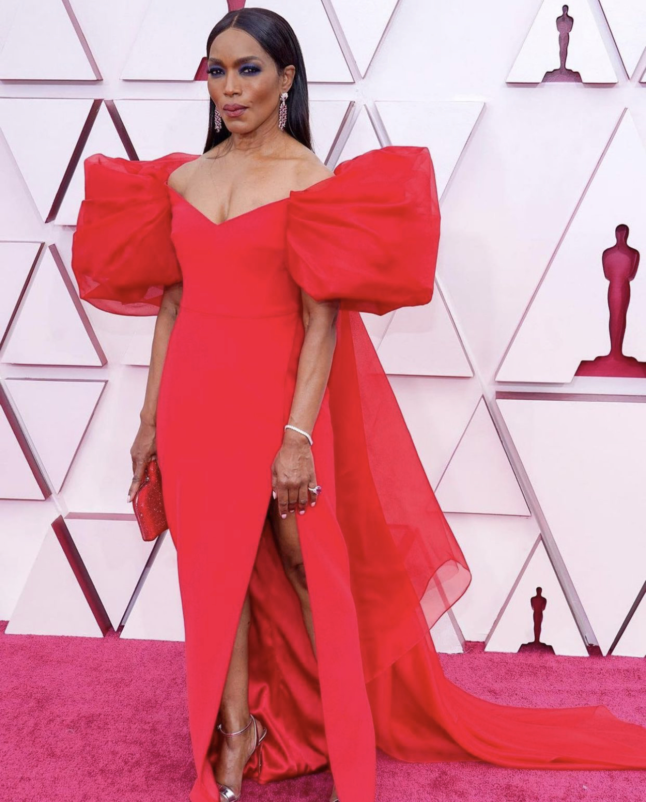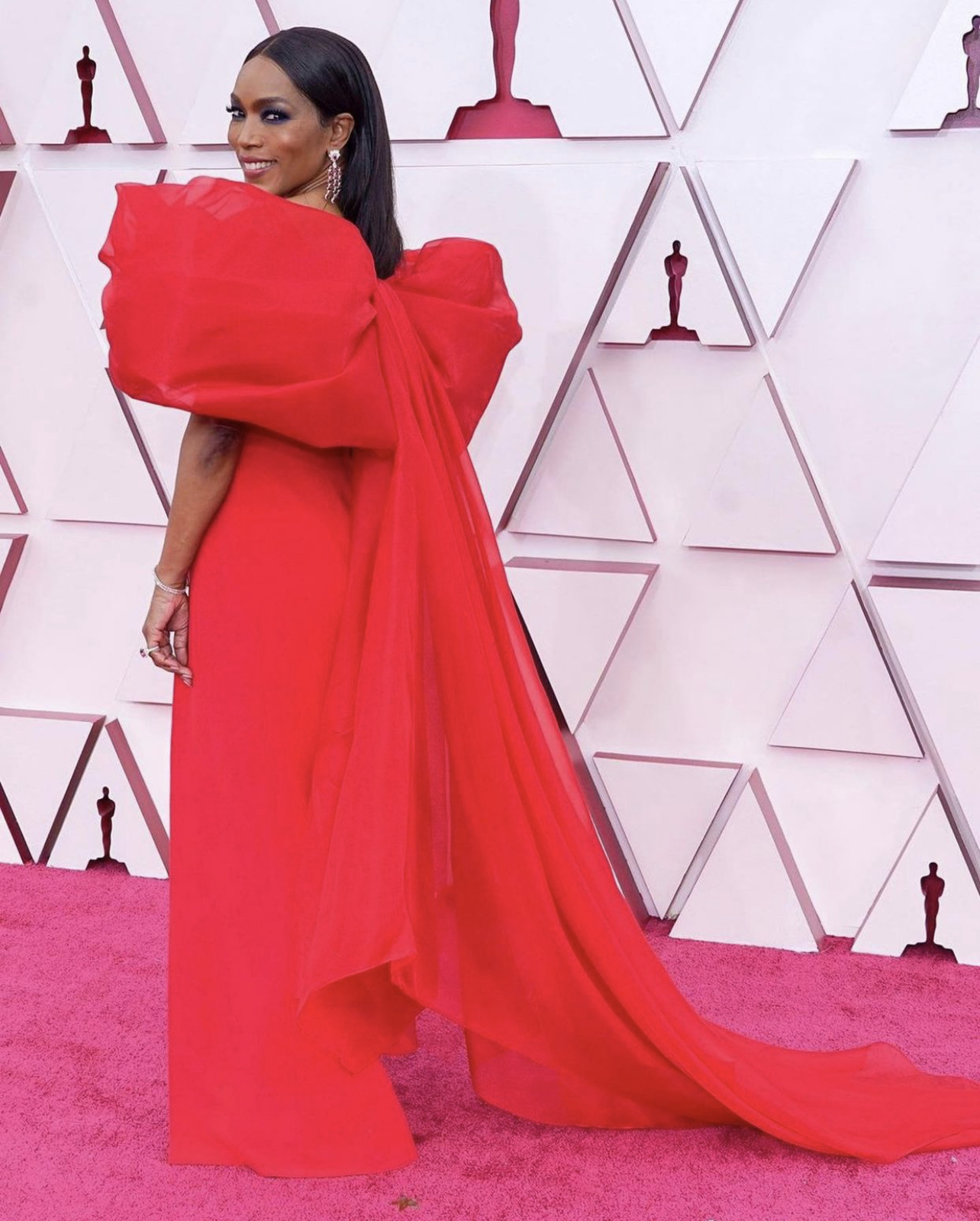 Angela Bassett was the ultimate gift with a bow on top at the 2021 Oscars (literally). Bassett wore Alberta Ferretti to the award ceremony, styled by Jennifer Austin. Her gown was custom made by the brand complete with an off-the-shoulder crêpe gown and organza bow that formed a dramatic train. The bow detailing essentially serves as puffed sleeves hanging off Bassett’s shoulders. Not to mention, the ensemble’s rose red color perfectly compliment’s the actress’s skin tone.