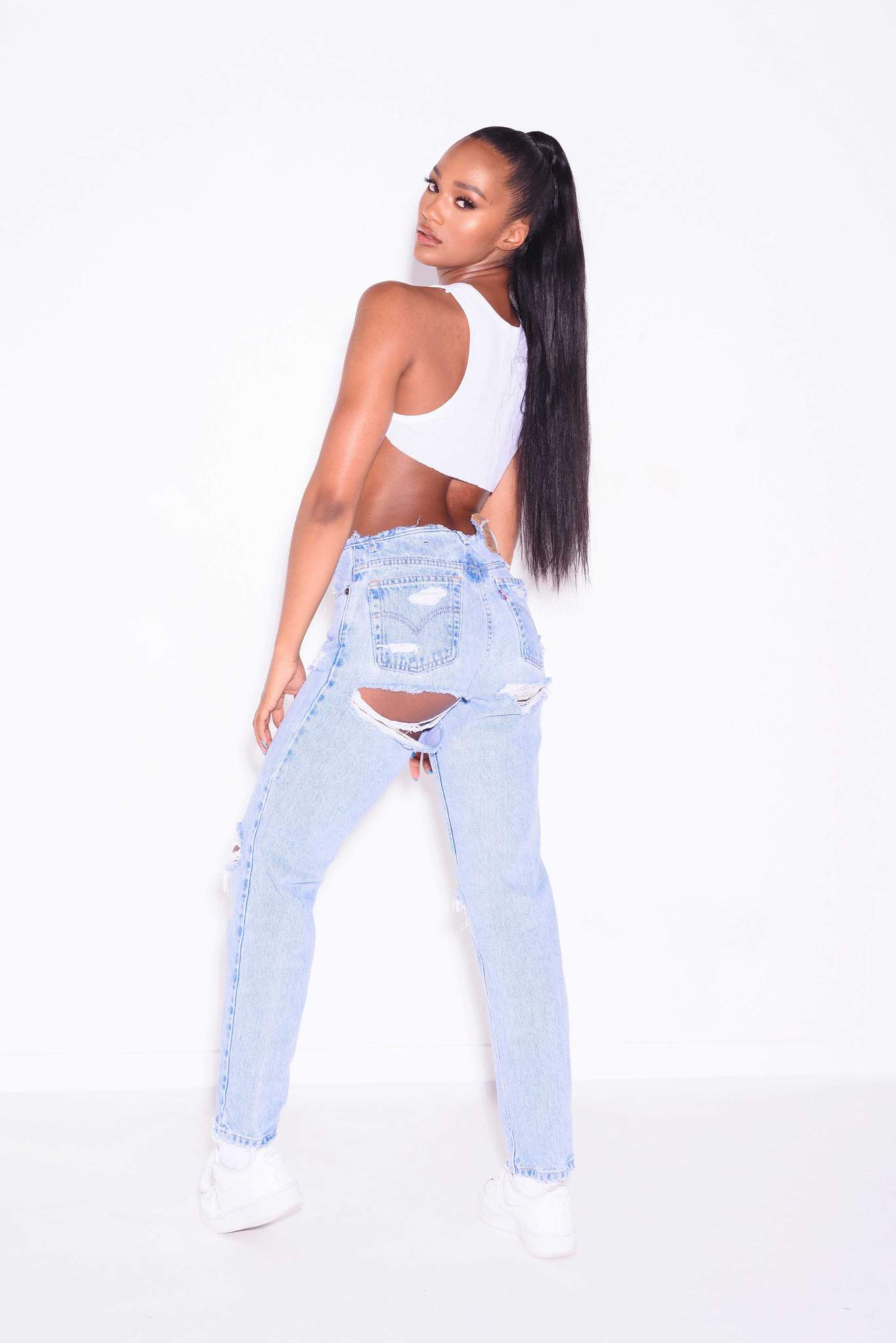 Lori Harvey wore a $2,260 Miu Miu jacket (sold out) and $165 Samaria Leah “Anita” jeans paired with $795 Calvin Klein 205W39NYC Camran two-tone patent-leather and suede sandals (sold out). She finished the look with $1,350 Loewe Puzzle Nano Bag in rouge along with a subtle pair of hoop earrings. She went a braided hairstyle and natural glam for her makeup.
