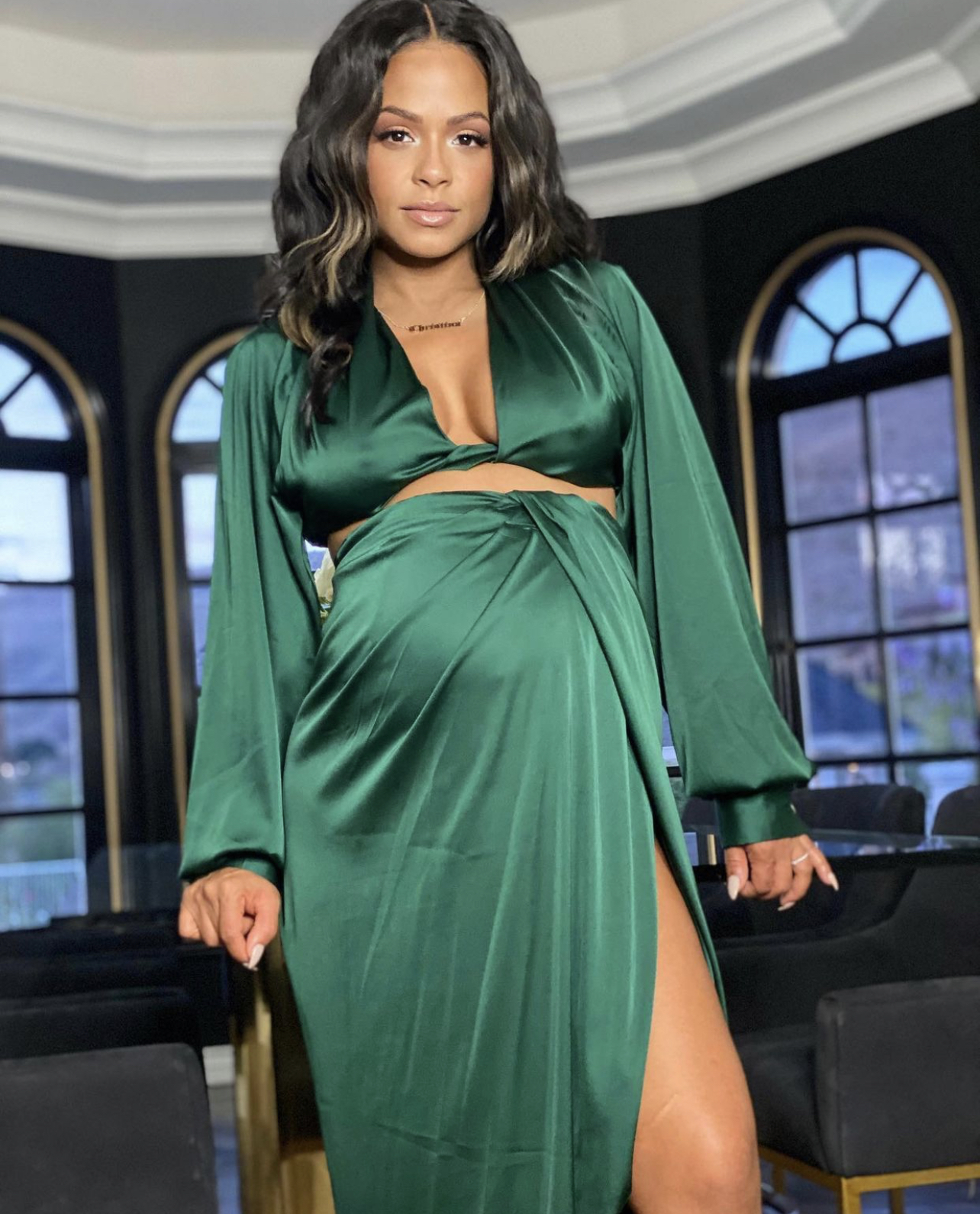 Christina Milian went out for a date night with her husband Matt Pokora in the perfect date night look. She struck a pose in a satin green top and skirt set from Fashion Nova that offered the ideal amount of chic and sexy. It also perfectly complimented her baby bump!