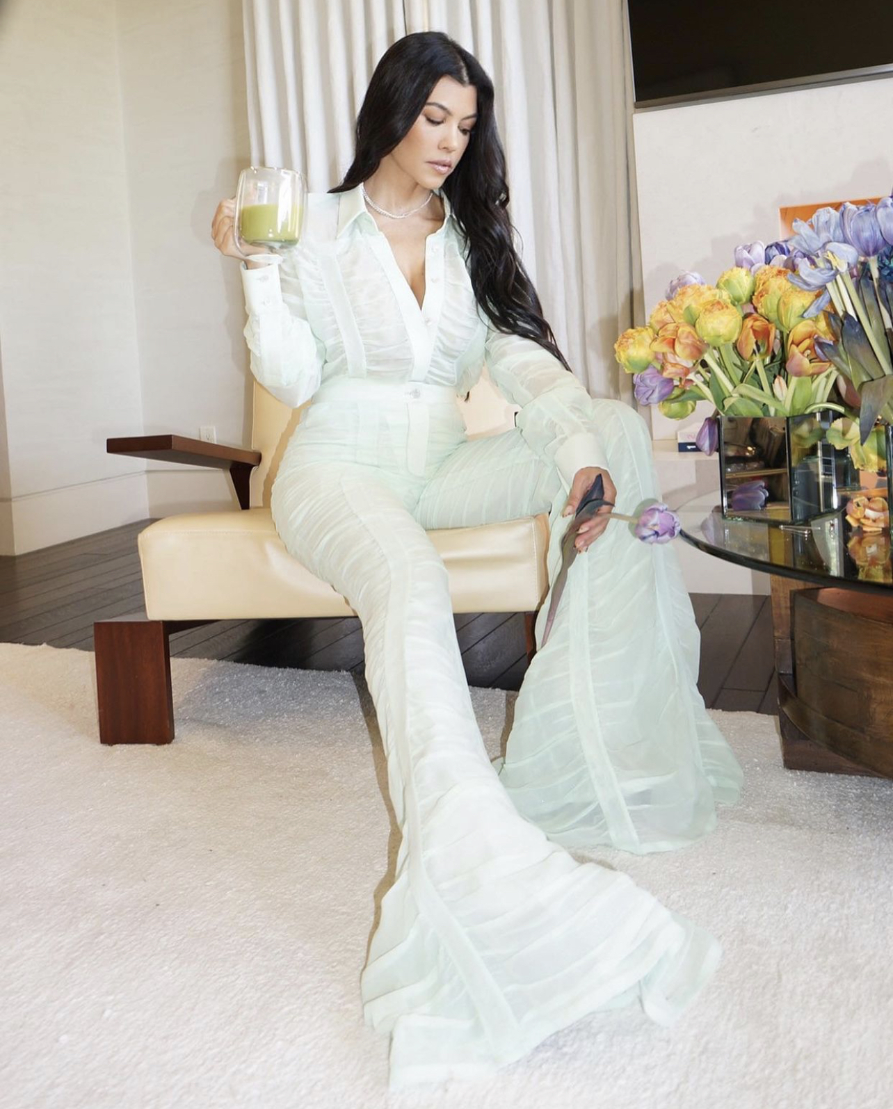 You Ask, We Answer! @ellemoraa says, “Could you please find out for us where this outfit is from ? Y’all rock!!!”, @fromtyewithlove adds, “Hi, do you know where this is from?” Kourtney Kardashian took to Instagram to promote her lifestyle brand Poosh, announcing the brand is dropping 27 new products this month. Of course, she made the announcement in the Kardashian-Jenner way donning a mint green designer look that complimented her green matcha drink in her hand.