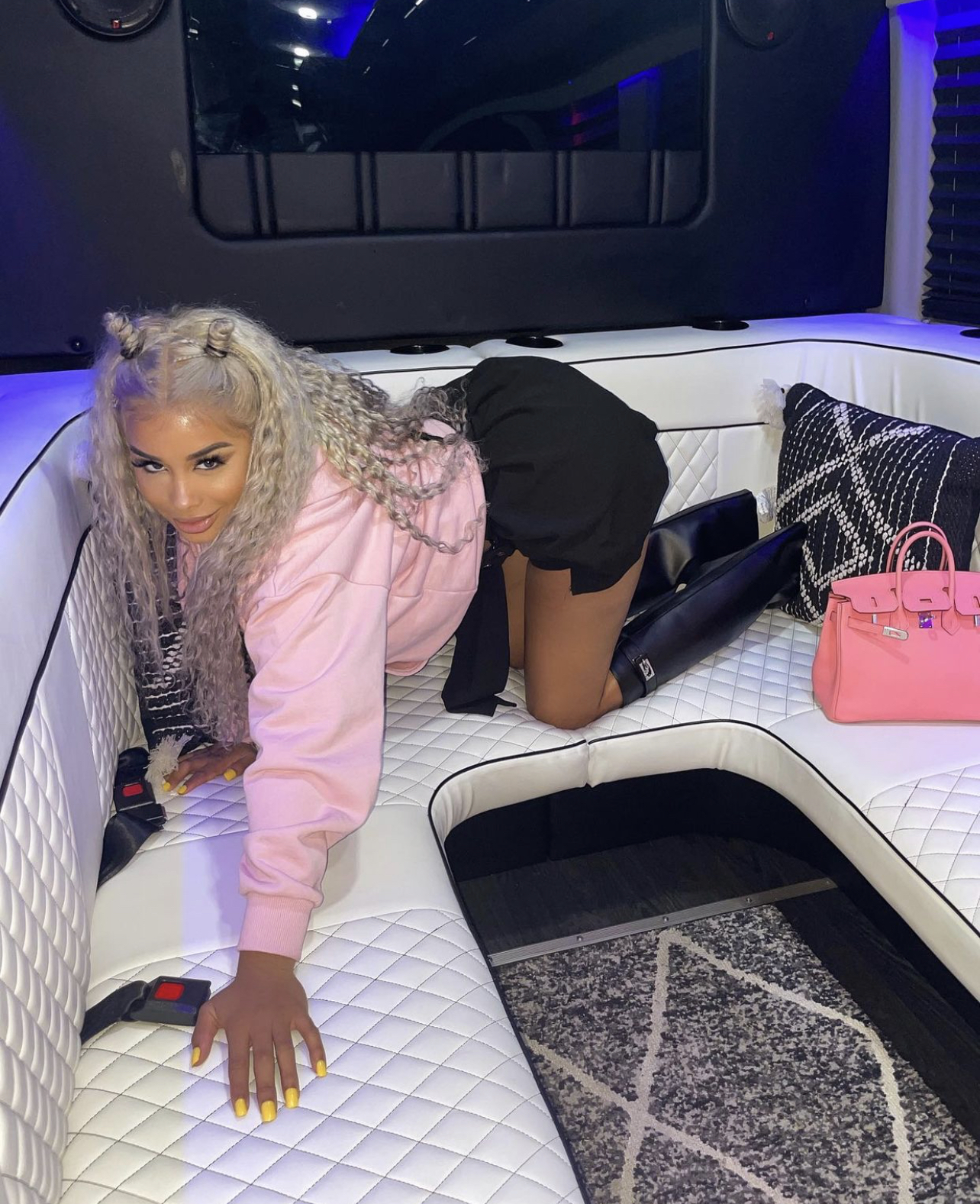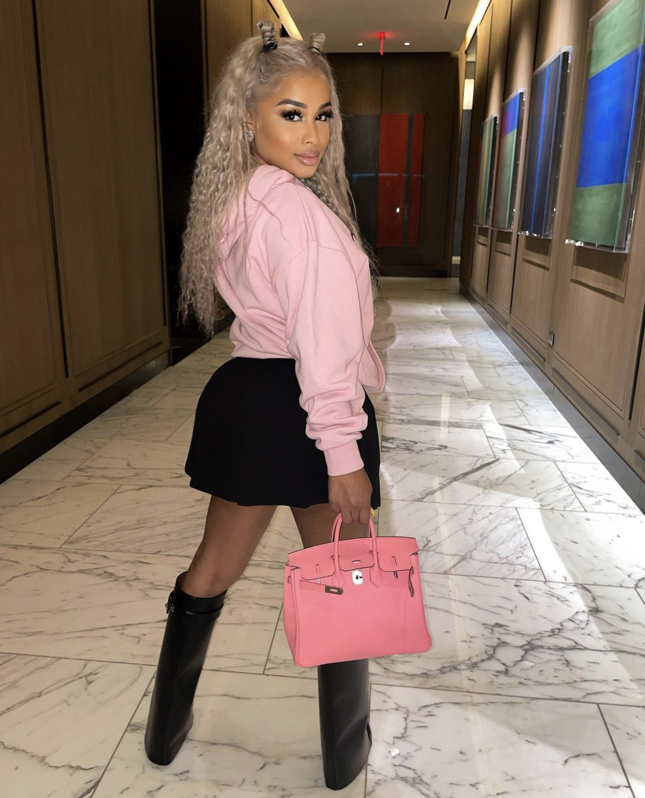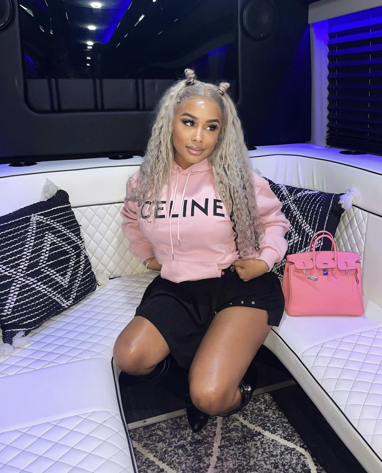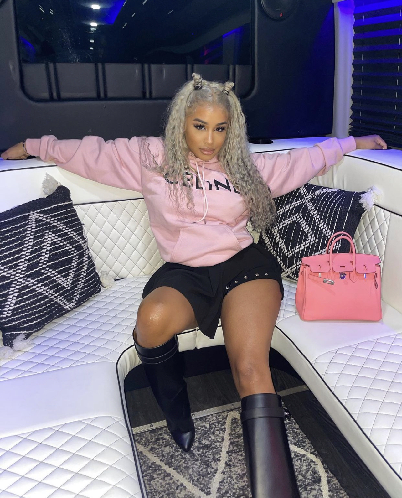 DreamDoll paired the skirt with a baby pink Celine hoodie and salmon pink Hermes Birkin bag along with a pair of black Givenchy “Shark Lock” boots.