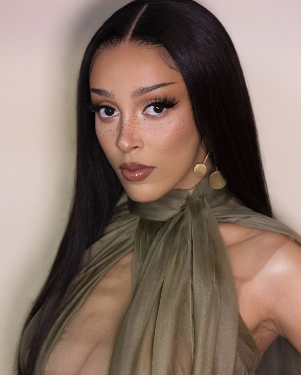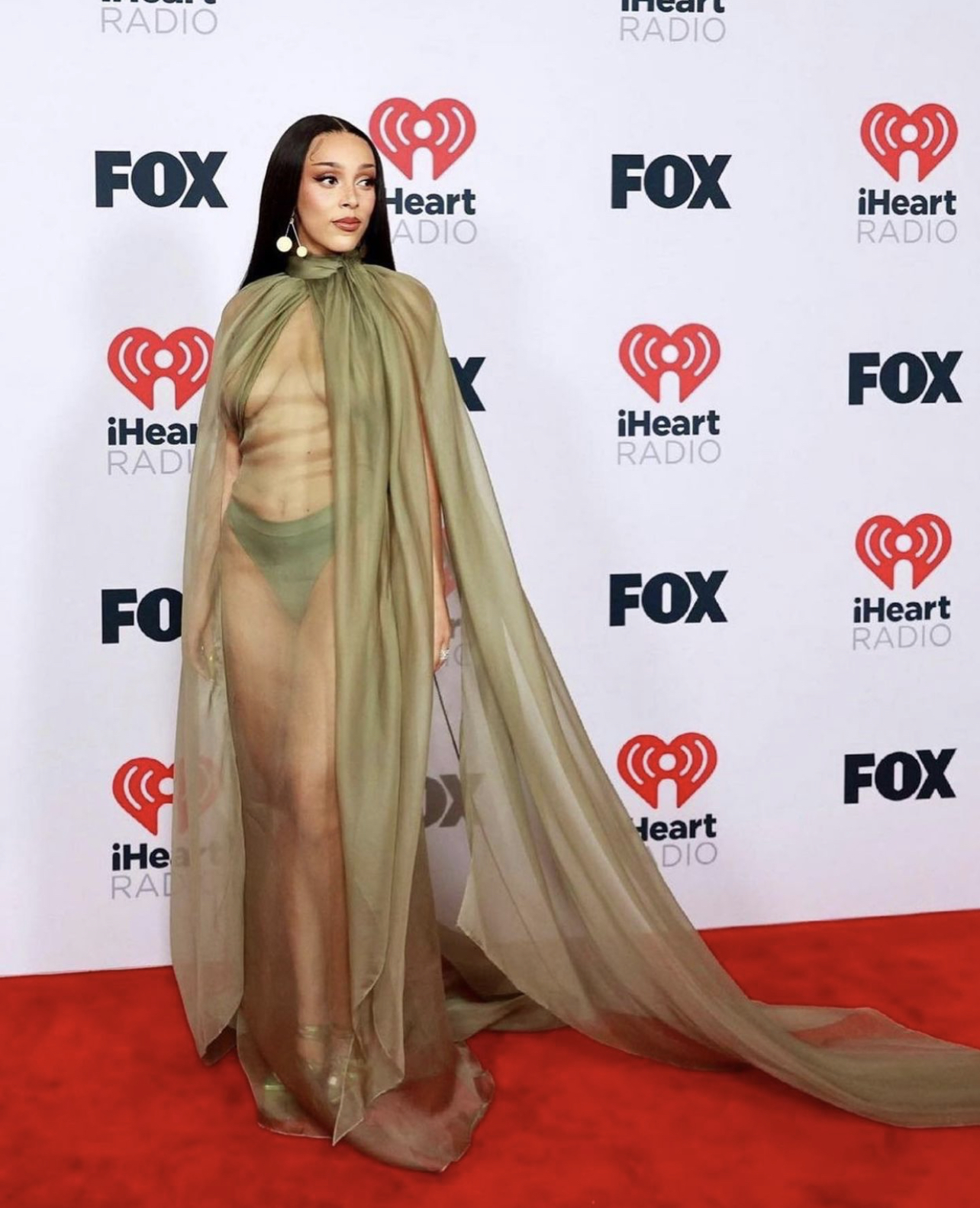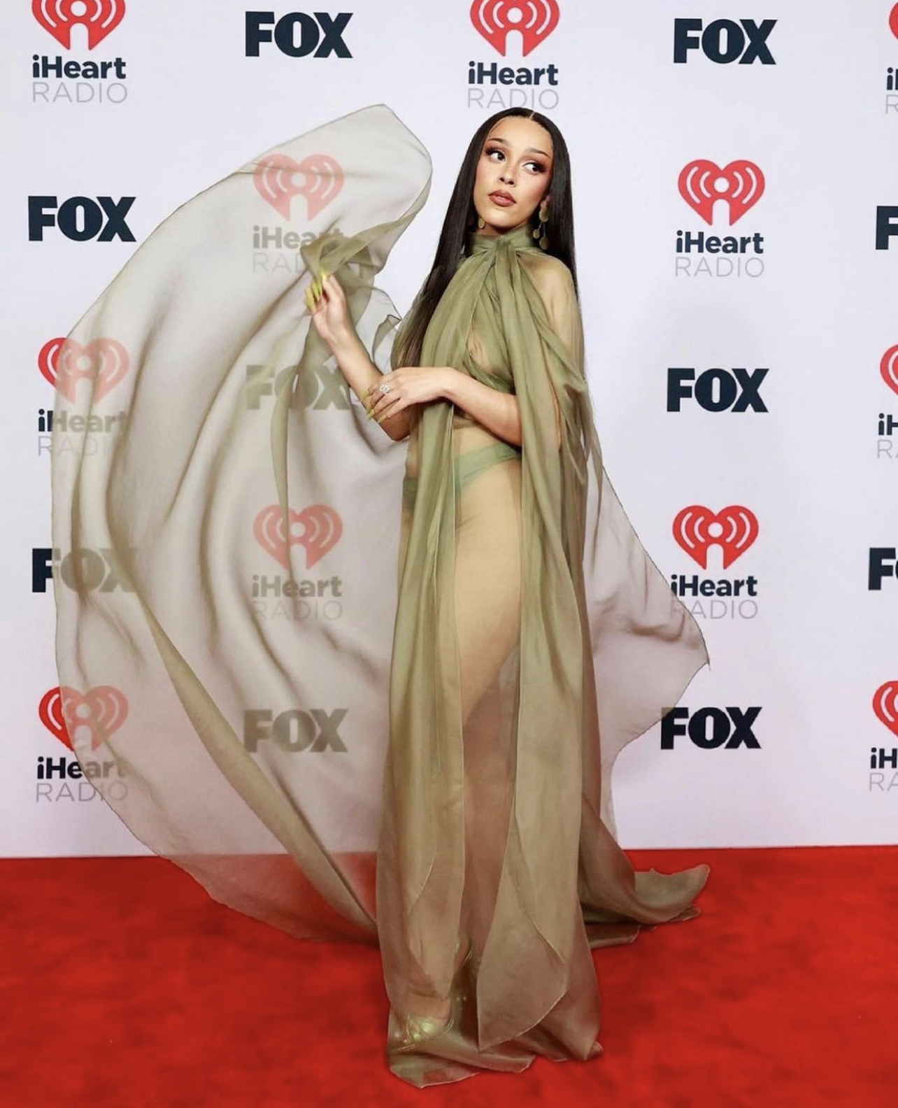 Doja Cat wore a Brandon Maxwell Fall/Winter 2020 gown to the 2021 iHeartRadio Music Awards, styled by Brett Alan Nelson. Outside of its sheer fabric, the gown offered many other surprises including its attached cape design and bow at the neckline complete with an a-line dress. She paired the revealing gown with a pair of D’accori “Belle” sandals and Roseark jewelry. She also went with bone straight hair for her hairstyle of choice.