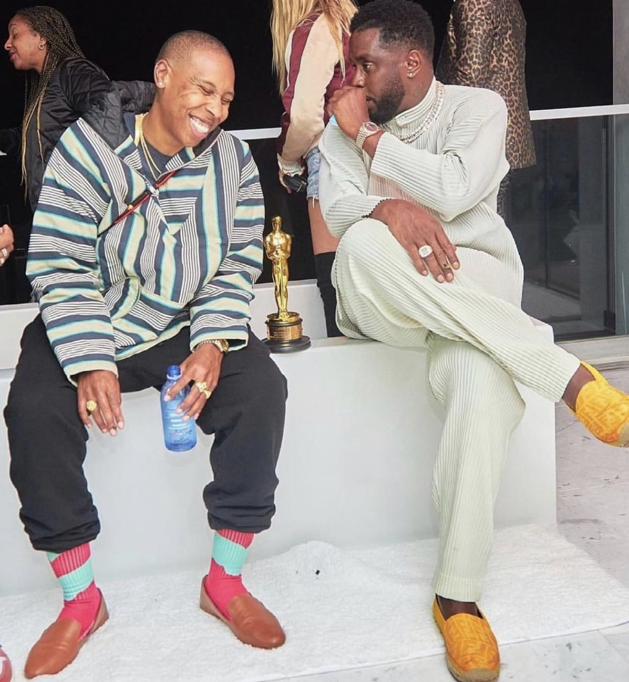 Lena Waithe wore a multicolor ensemble with Nike Air Fear of God 1 “The Question” sneakers as she caught up with Diddy.