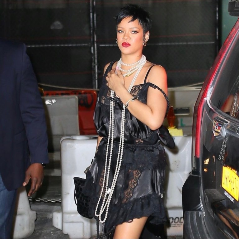 Rihanna was spotted in Los Angeles wearing a $665 Alexander Wang Black lace pj dress paired with $755 Manolo Blahnik “Allura” heels.