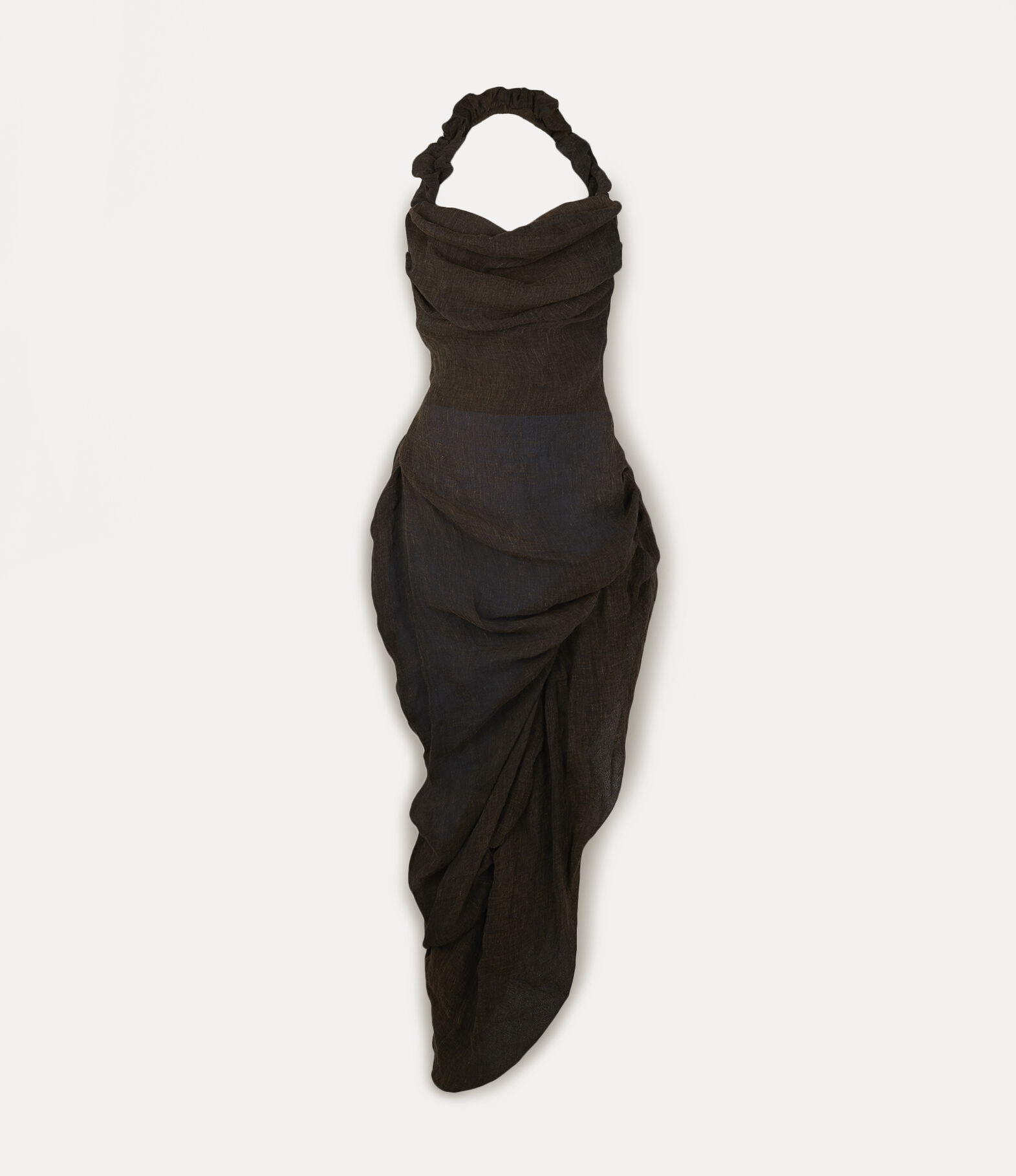 Kim Kardashian wore a custom Vivienne Westwood Cocoette Dress in copper paired with Manolo Blahnik “Leva” sandals (sold out) and custom diamond cross necklaces and pear diamond earrings by Lorraine Schwartz.