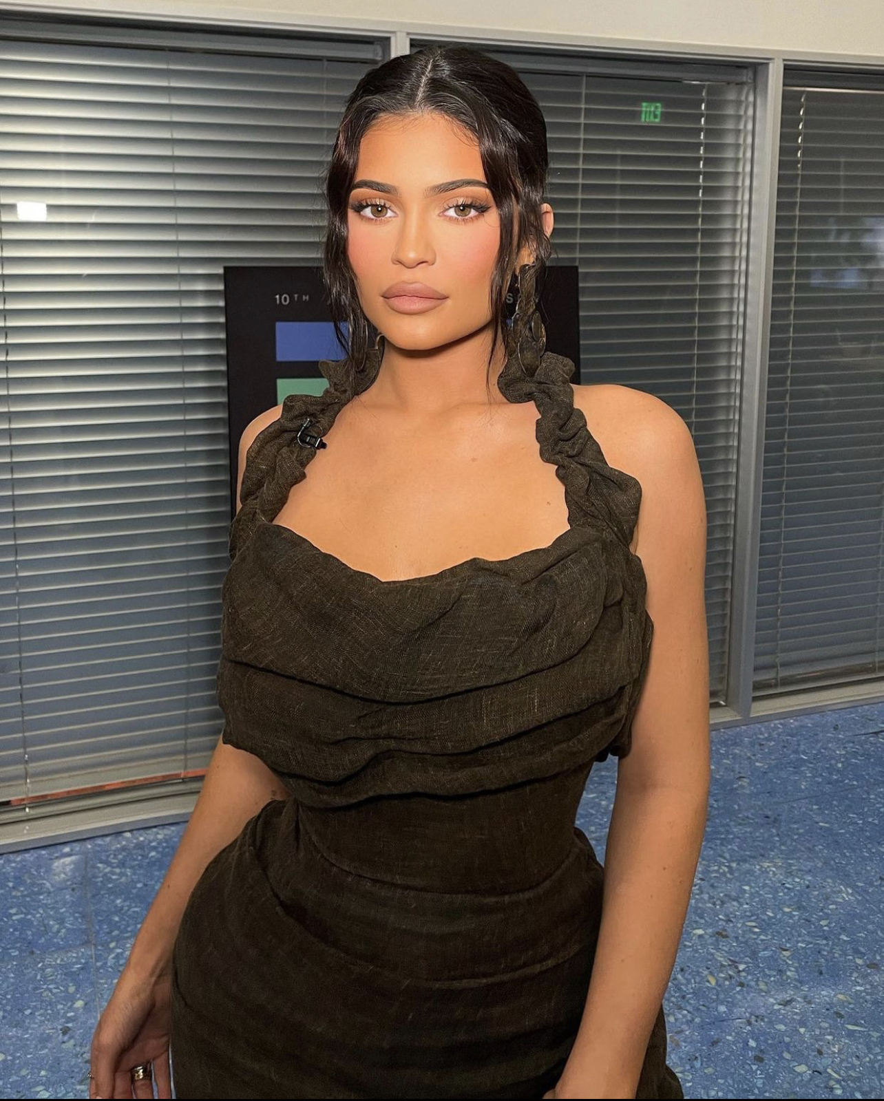 Kylie Jenner wore a $5,240 Vivienne Westwood “Helenae” dress (sold out) paired with earrings from the brand and $795 Gianvito Rossi Stark Plexi Ankle Strap Heels.