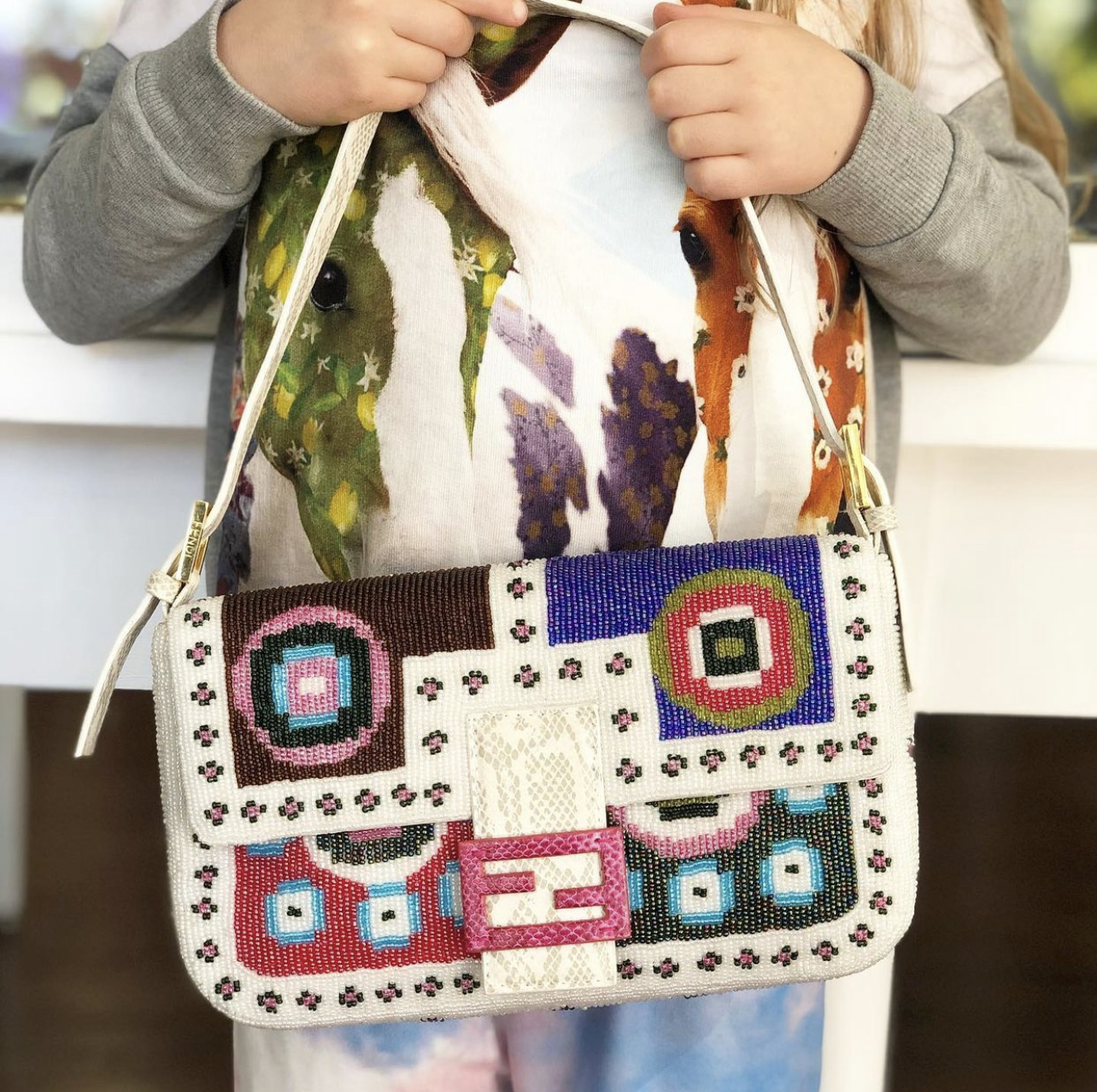 Rihanna wore a Dior by John Galliano pink dress paired with $700 Pink Rhodonite Beaded Multi-strand Masai Necklace also by Dior (sold out) and a pink fur bucket hat by Emma Brewin. She completed the look with $1,150 Tom Ford Gold Python Padlock Sandals (sold out) and a Fendi 1990s Baguette Beaded Bag from Vintage By Misty.