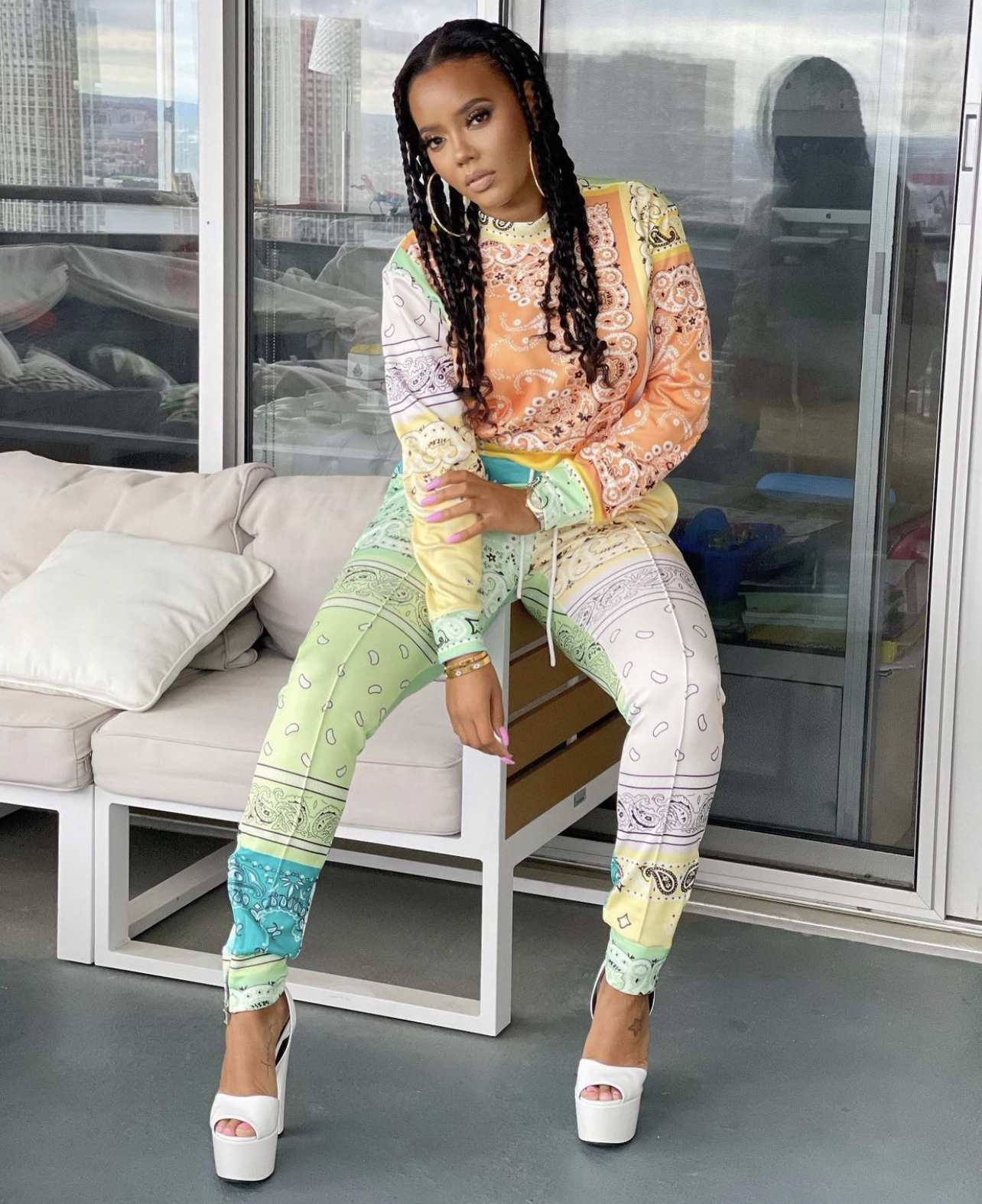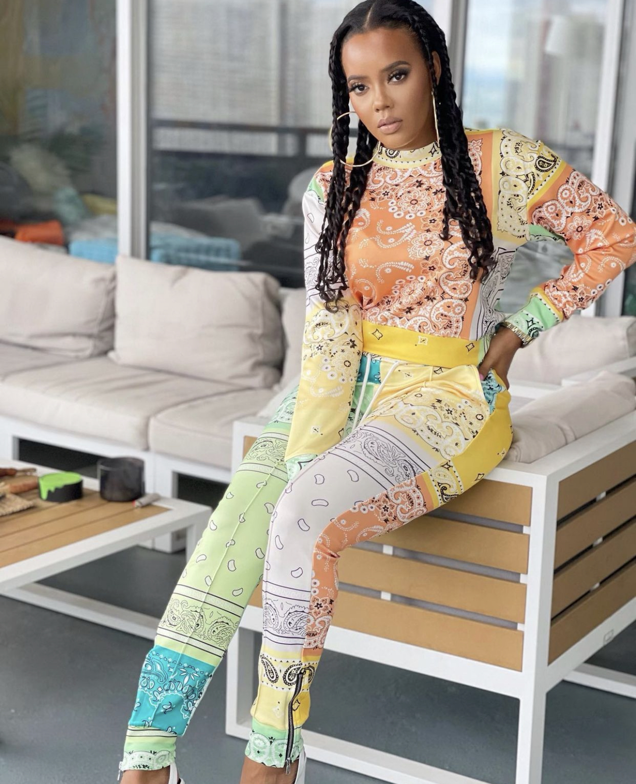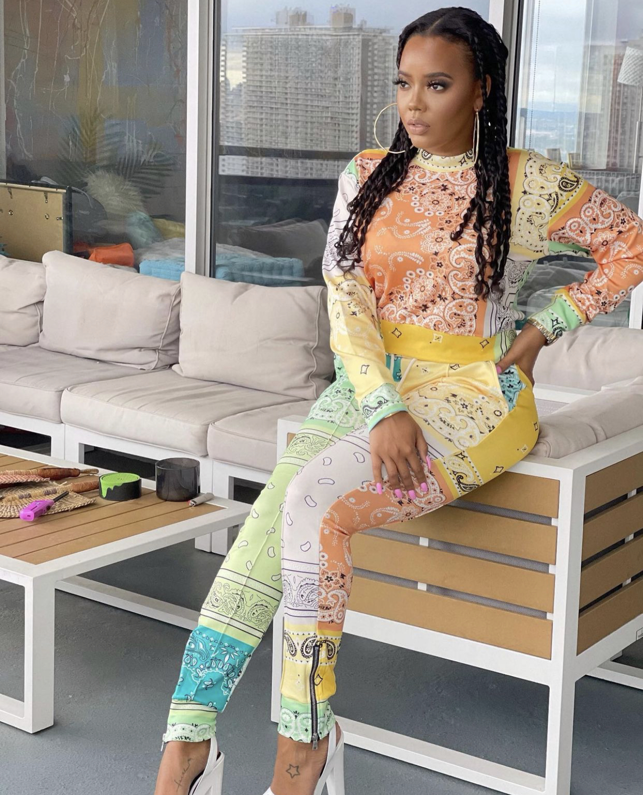 Angela Simmons struck a pose at her home in a cozy multicolor ensemble. Sporting a braided hairstyle, she dressed up a multicolor bandana print set by Fashion Nova.