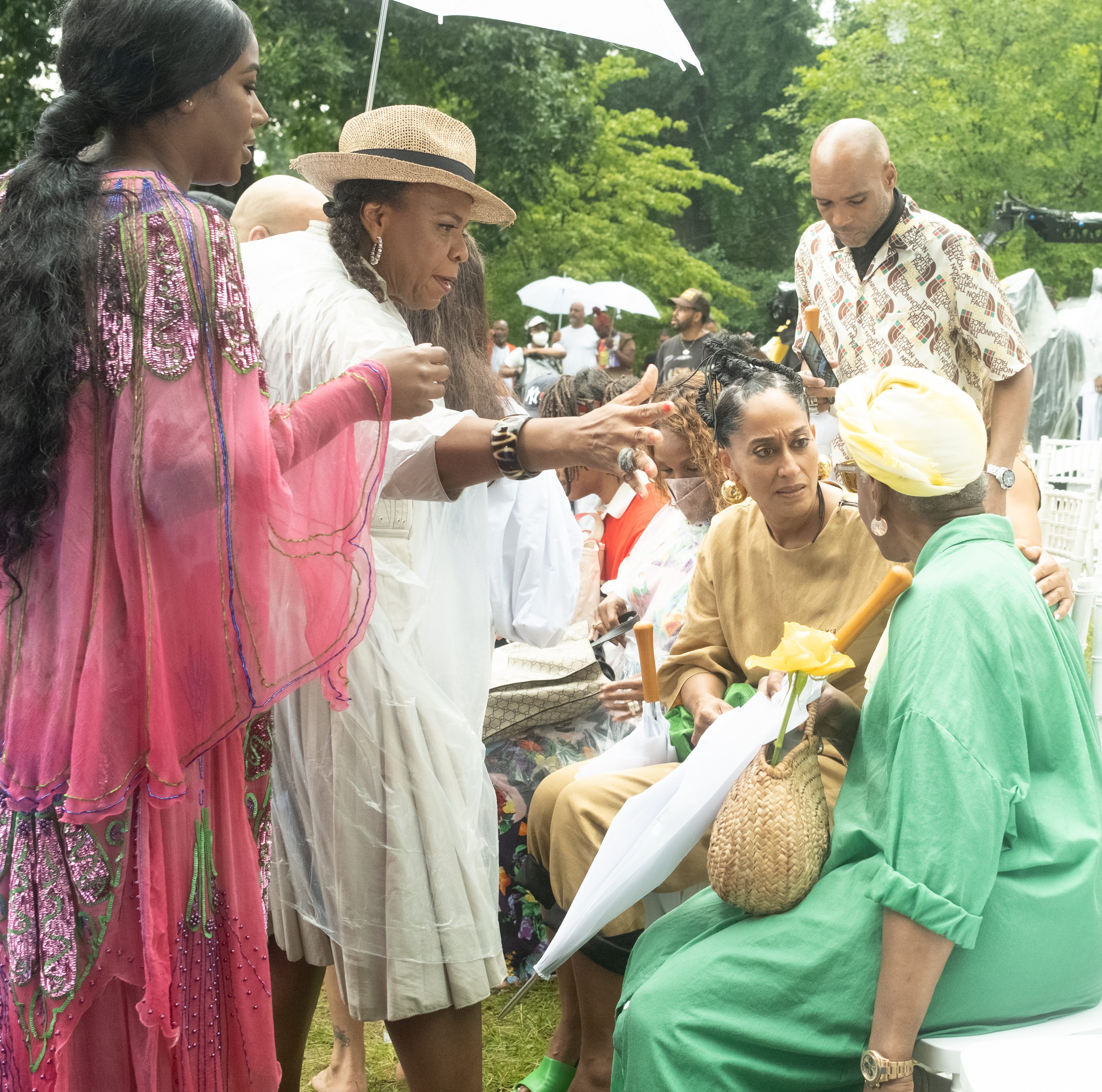Initially, guests weathered the storm, sitting underneath white umbrellas and ponchos, provided by the Pyer Moss team. When the thunder and lightning started, everyone ran for shelter, with many huddling on Walker’s massive, white columned porch, leading to an intimate experience. Celebrity Stylist Law Roach, Reporter Teri Agins, Iconic Designer Byron Lars, and more, rubbed elbows with Madam CJ Walkers great-great granddaughter, Alelia Bundles.