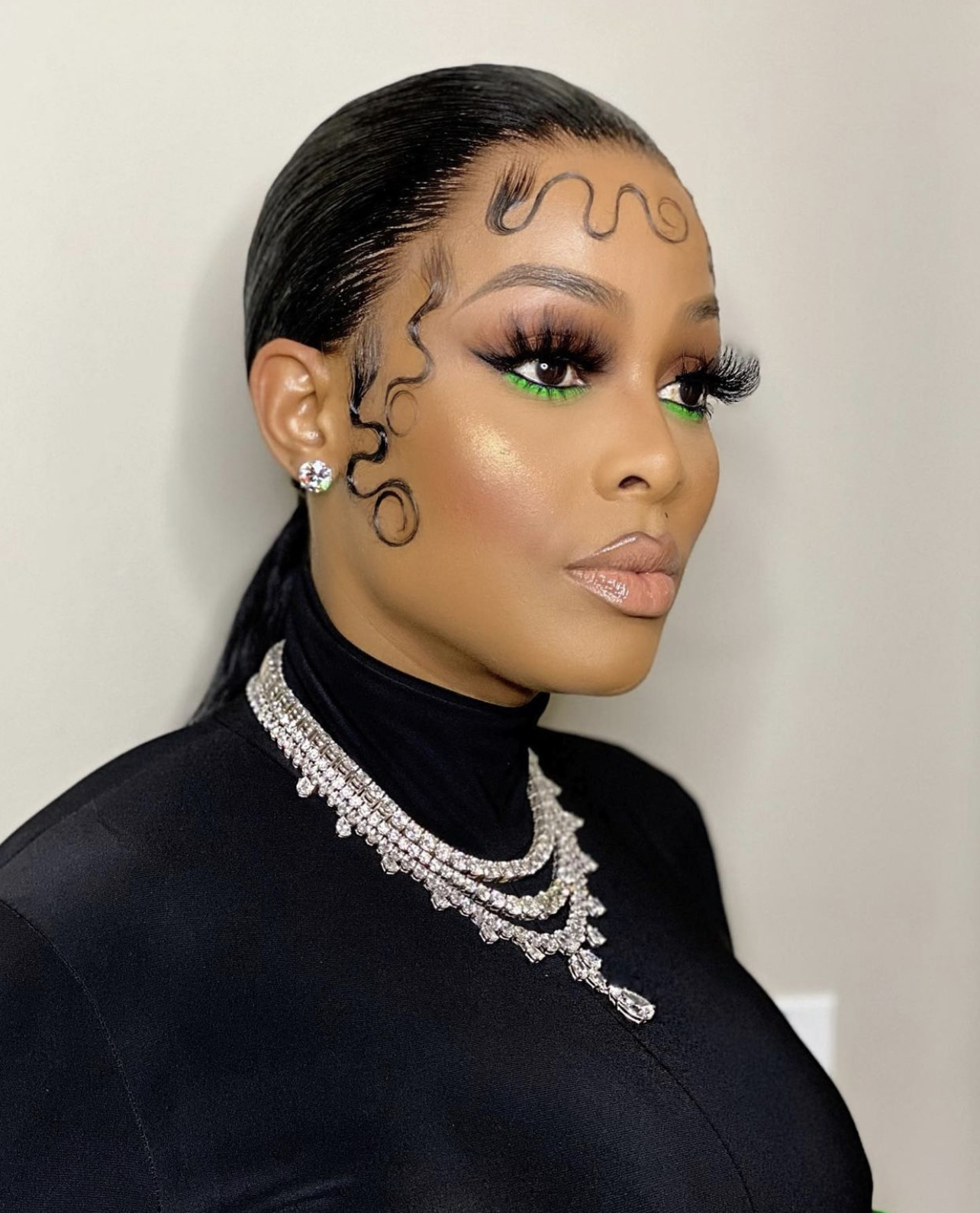 Keyshia Ka’oir wore a black high-neck body-hugging jumpsuit paired with Bottega Veneta accessories in order to achieve those green accents. I mean, what better way to show pops of green than with Bottega Veneta’s distinctive lime green color? Keyshia accessorized the jumpsuit with Bottega Veneta’s $2,500 corset in parakeet and $1,790 “Flash” knee-high boots in black grass. She also carried a Hermès Birkin black croc bag. Getting into the spirit of the game, Keyshia also wore hints of green in her eye makeup, executed by MLatrice MUA.