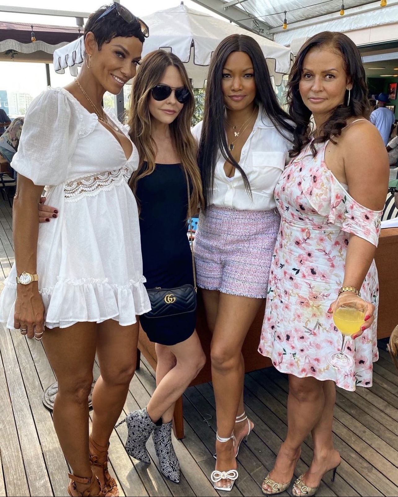 Garcelle Beauvais was spotted out enjoying some daytime festivities at Harriet’s Rooftop in LA with Nicole Murphy, Allison Melnick, and Lisa Bubbles. She served up brunch-time chic in a stylish look which included a pair of Cult of Coquette sandals from Fashion Bomb Daily Shop.
