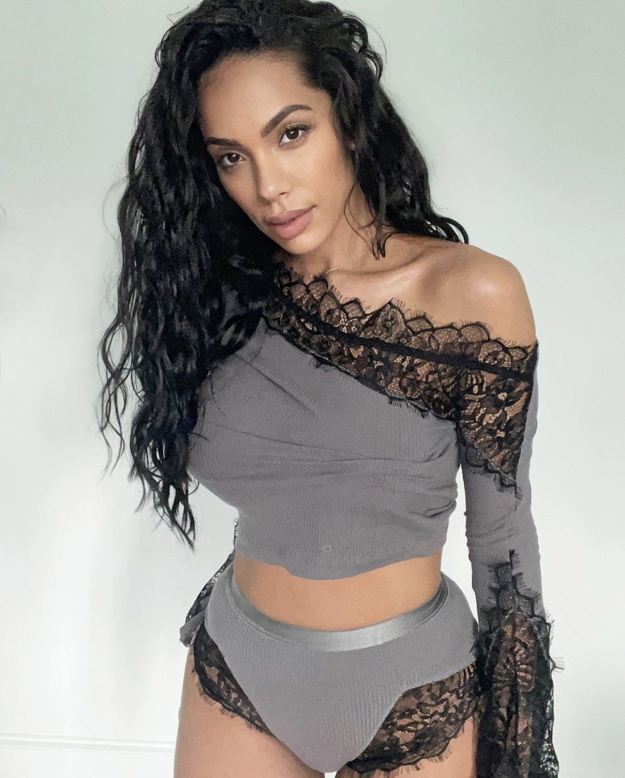Erica Mena wore Fashion Nova’s $39.99 Flirty Cuddles Ribbed Lace PJ Short Set in grey/black. Also coming in rose and black, the pajama set features a long sleeve one-shoulder top and cheeky shorts, both adorned with a delicate lace trim detail. Erica Mena wore loose beach-like waves with light makeup for glam.