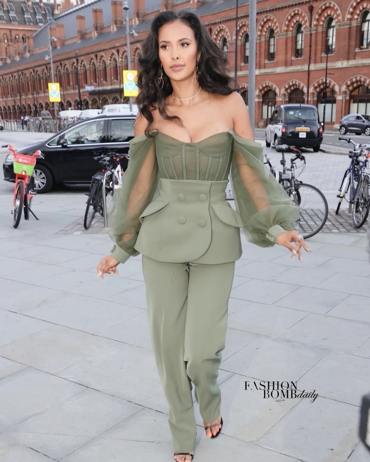Maya Jama was spotted heading to the Dazn x Matchroom VIP launch event in London in a head-turning olive green look fresh off the Fall/Winter 2021 runway.