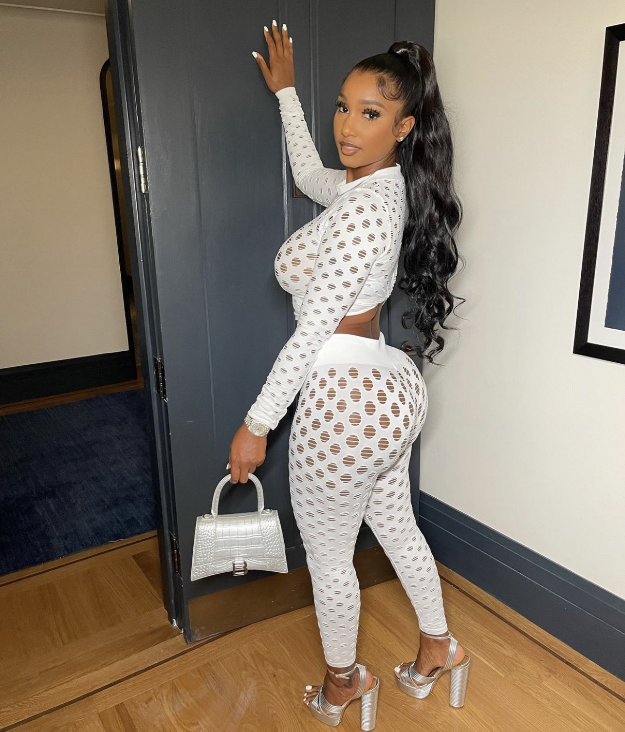 Bernice Burgos wore Fashion Nova’s $34.99 Enough Play Legging Set in white. This particular set is quite the show-stopper as it consists of a long sleeve crop top and high waist leggings in an allover distressed hole design. While Bernice’s white colorway is sold out, the set is still available in brown. She accessorized the set with silver accessories including silver platform heeled sandals and a Balenciaga “Hourglass” silver croc handbag. She rocked a curly ponytail for her hairstyle of choice.
