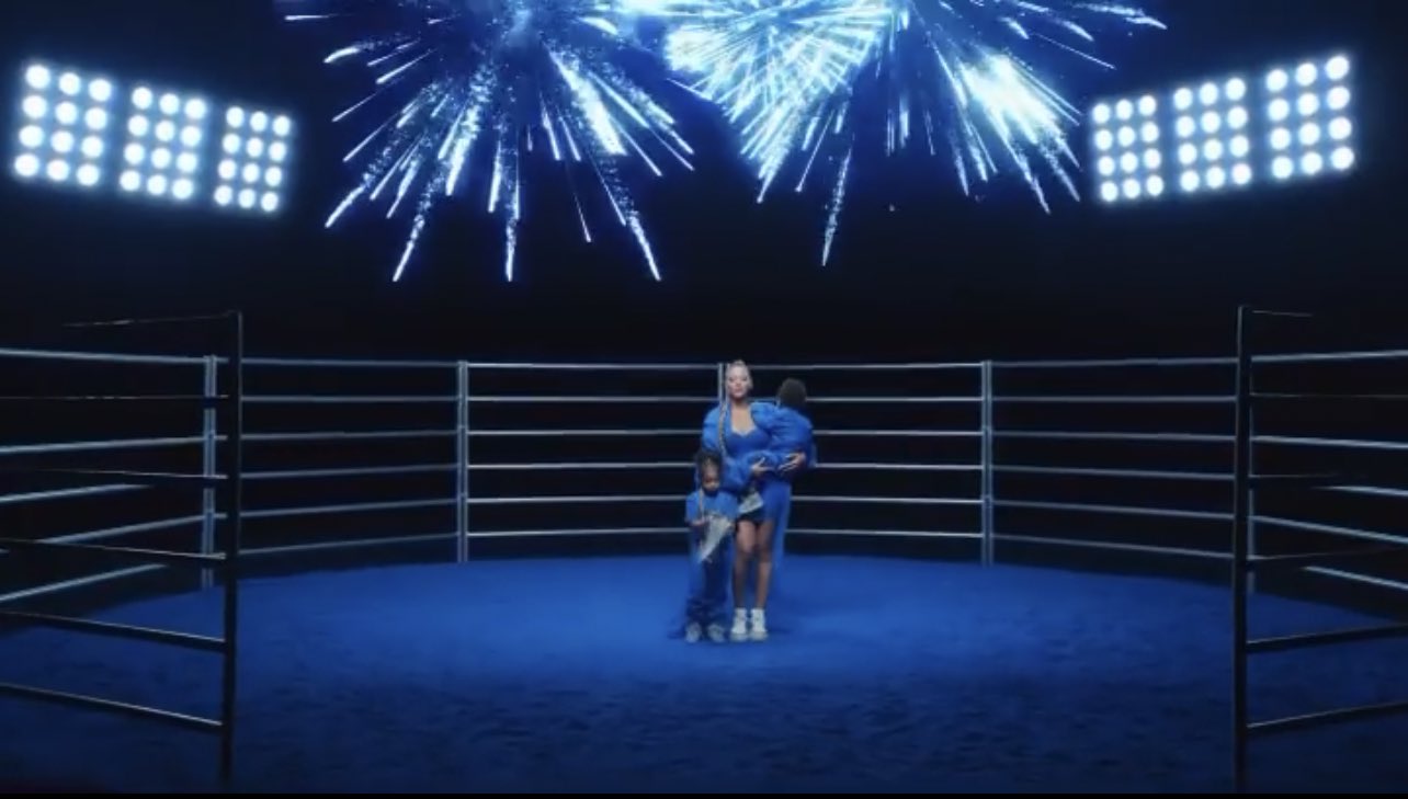 To commemorate the launch of the duo’s first kids’ products, a campaign video surfaced today which featured Beyoncé‘s children Blue Ivy and twins Sir and Rumi Carter. Blue Ivy saddled up with her mom wearing a matching look including the kid’s version of the collection’s purple hoodie, purple cow print leggings, and Forum Mid sneakers. Sir, held by Beyoncé, appeared in a frame from the video wearing the collection’s blue cowboy hat and what appears to be a jacket.